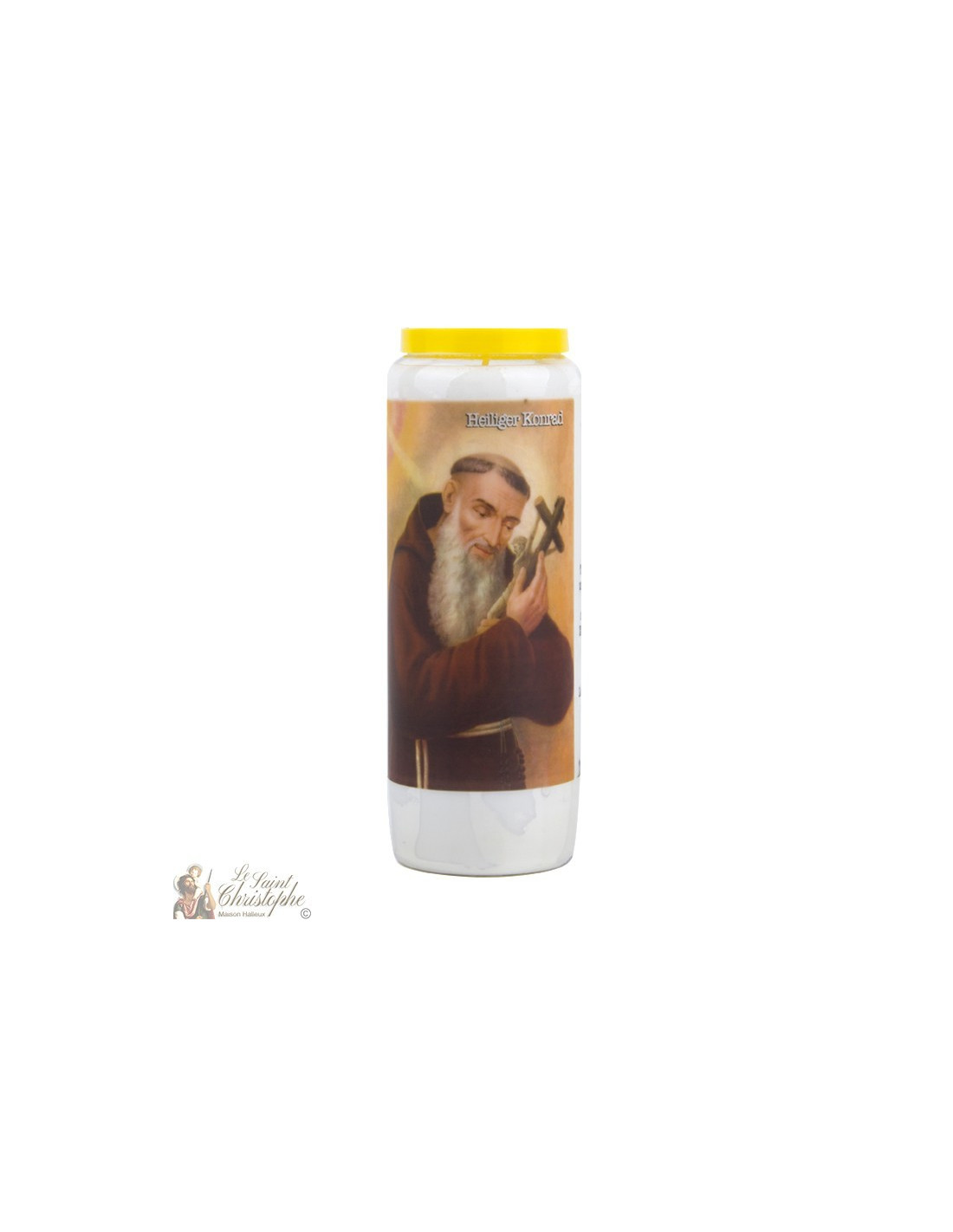 Novena candle with the image of Saint Conrad on the front and a prayer dedicated to him on the back.