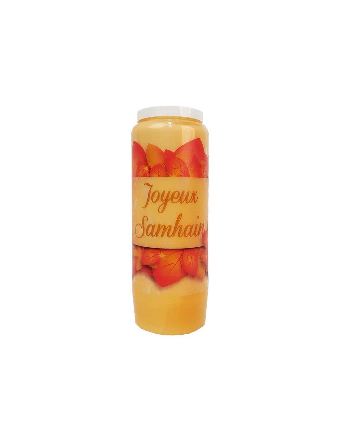 Orange novena candle with an image of autumn leaves and the inscription Happy Samhain. The image is transparent for a photophore effect.