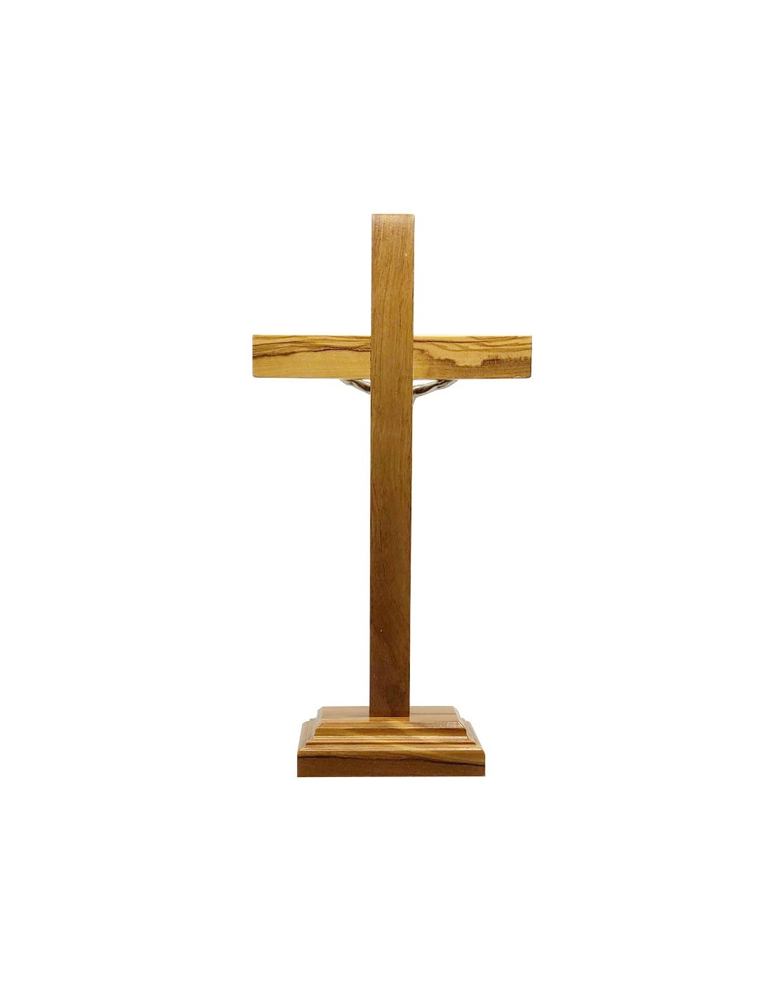 This olive wood cross is a magnificent spiritual piece, both understated and imbued with strength. Mounted on a base, it stands out for the warm beauty of its natural olive wood, enhanced by the presence of Christ crafted in beautifully crafted silver-plated metal.