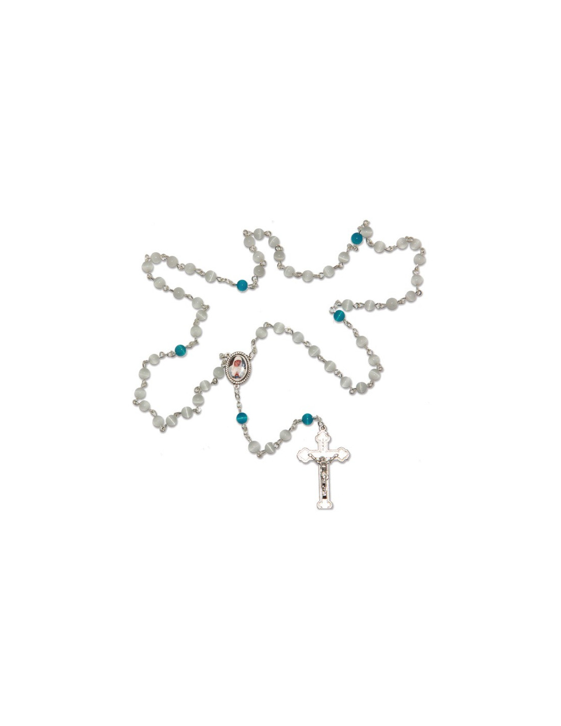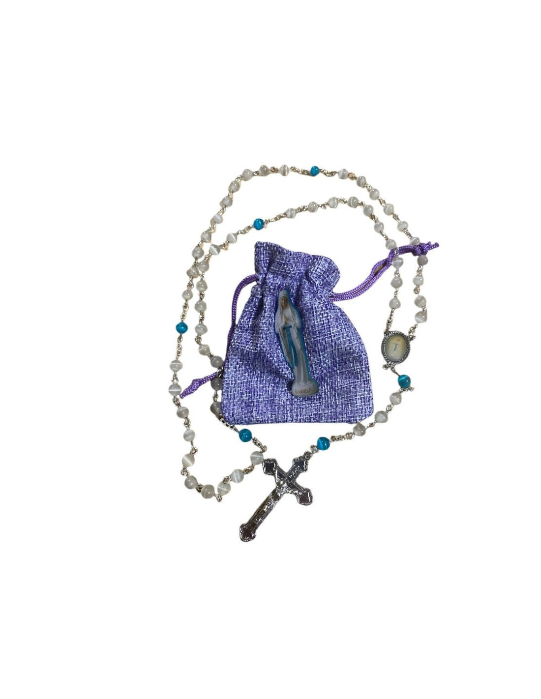 White and blue cat's eye moonstone rosary, mounted on a silver chain, for a soft and relaxing glow with a hint of color. The central medal is the image of the Virgin of the Poor. The rosary comes with a black storage pouch and a pin of the Virgin of Banneux.