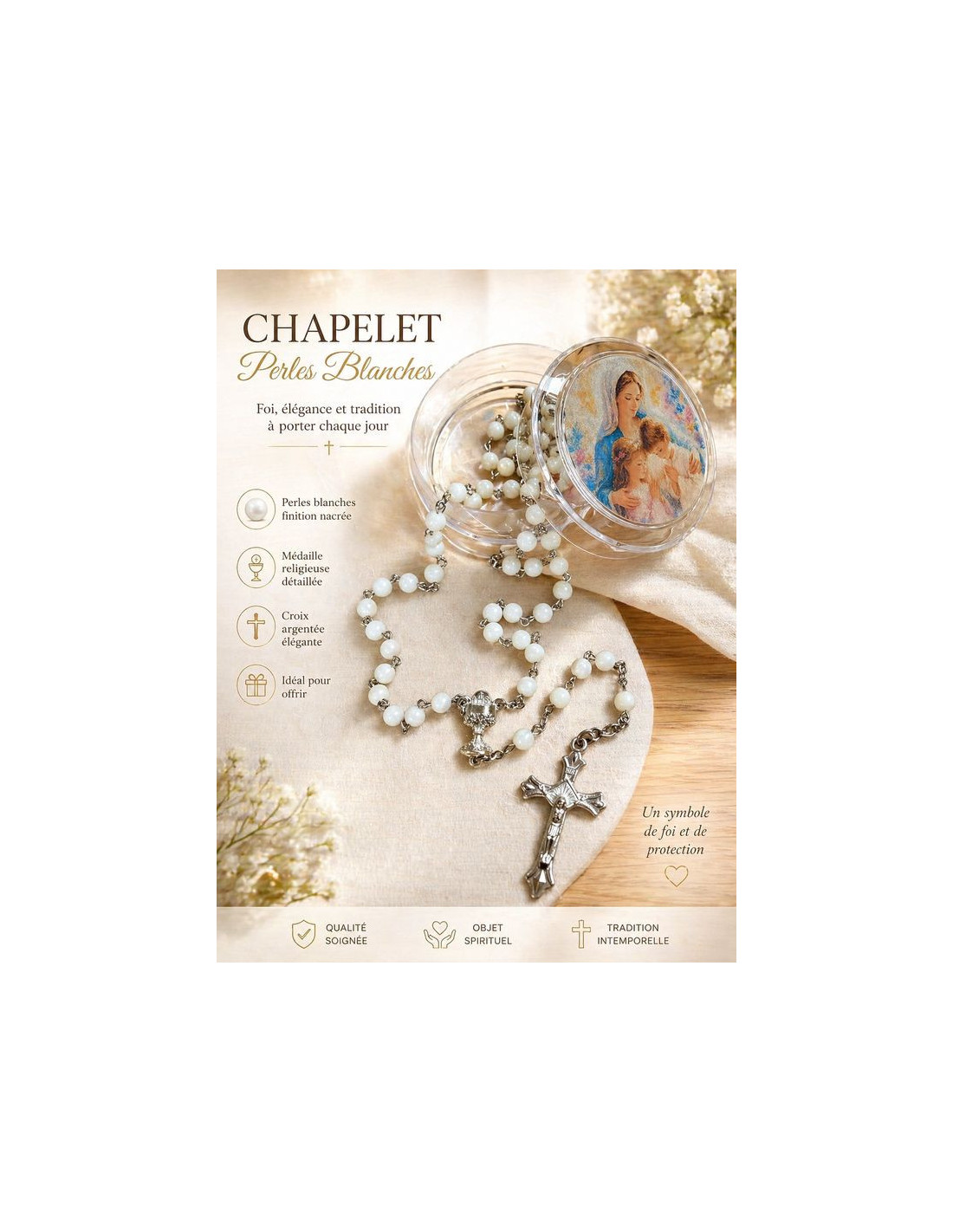This mother-of-pearl rosary stands out for its elegance and natural softness.