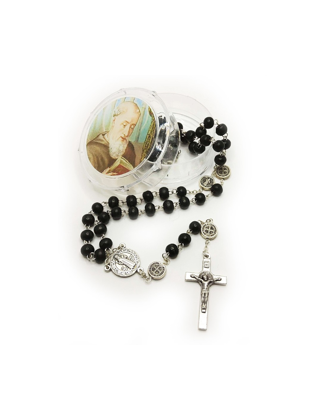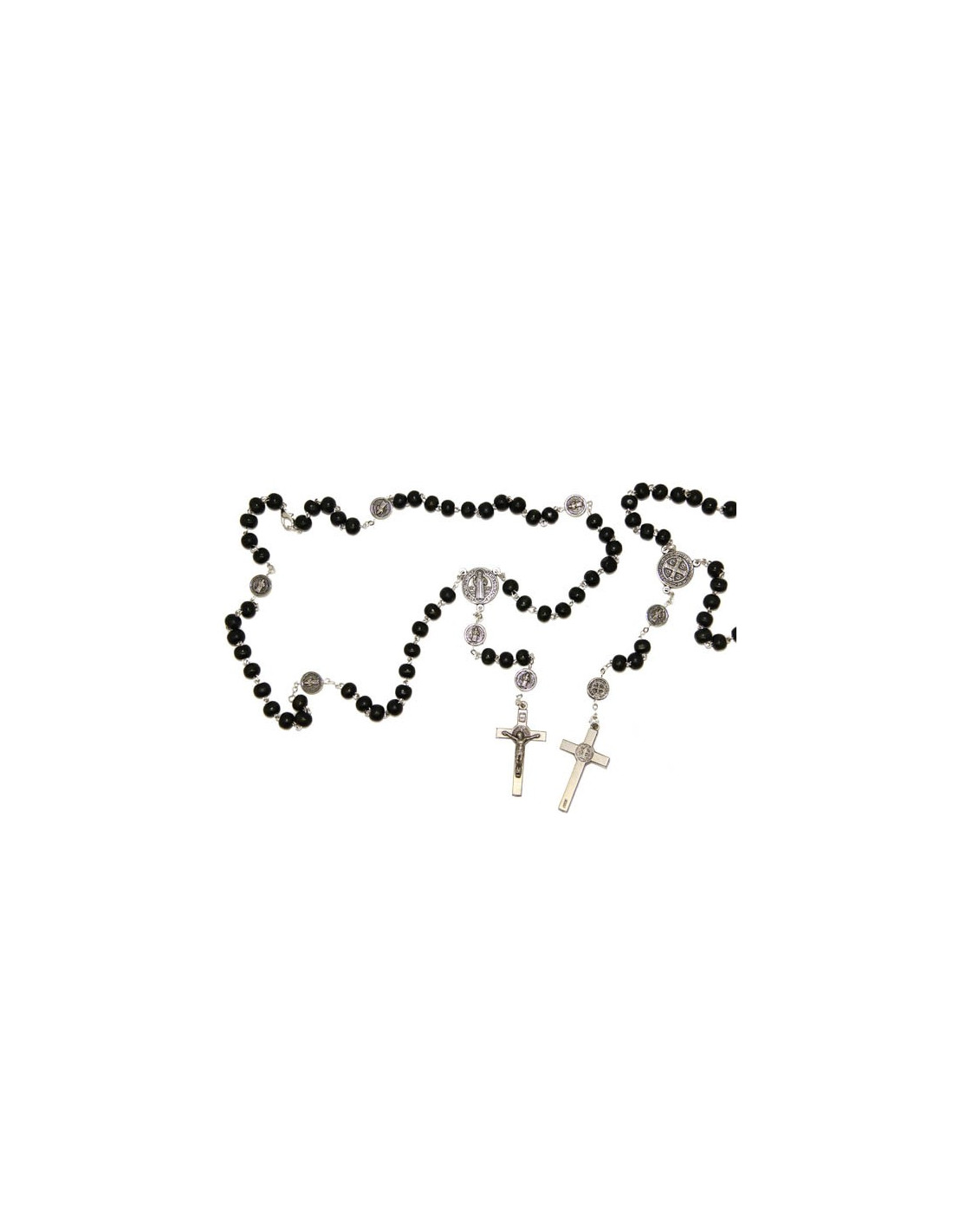 This silver plated metal rosary with black wooden beads is decorated with several medals of Saint Benedict, a powerful symbol of protection, and a cross of Saint Benedict.
