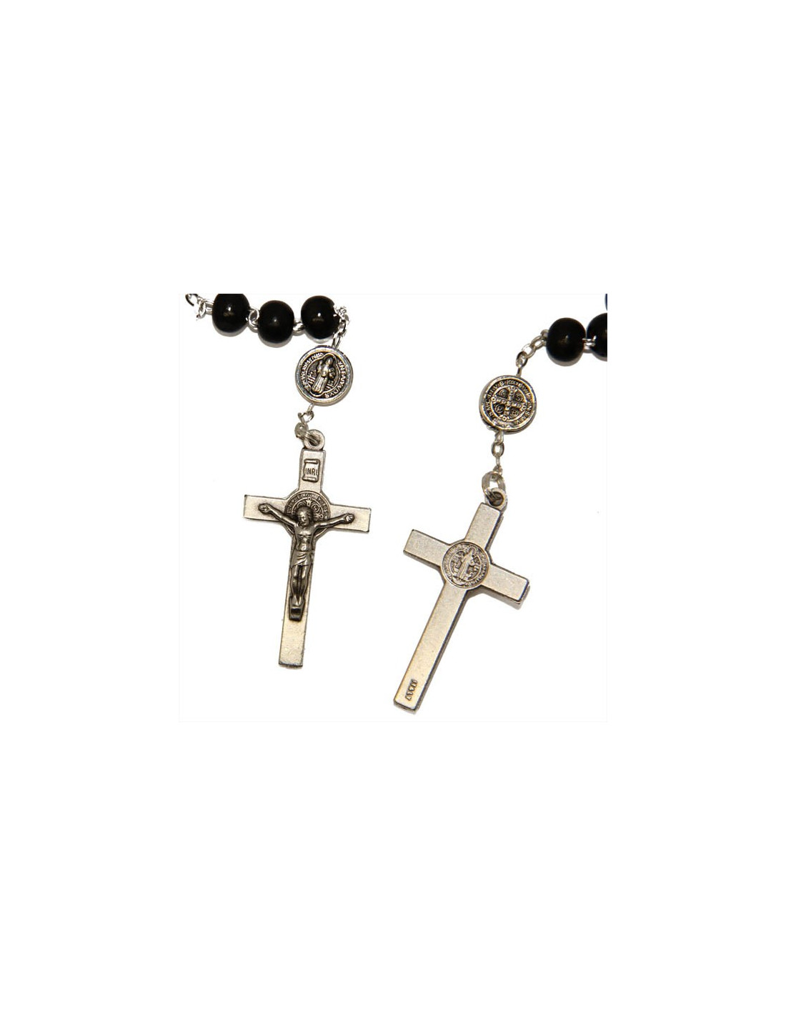 Rosary with black wood beads mounted on a silver metal chain. The cross and metal beads are the effigy of the medal of Saint Benedict, a powerful symbol of protection.