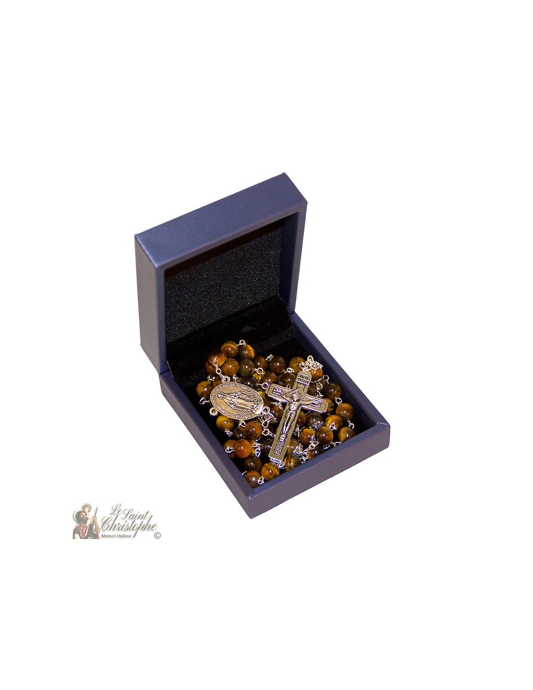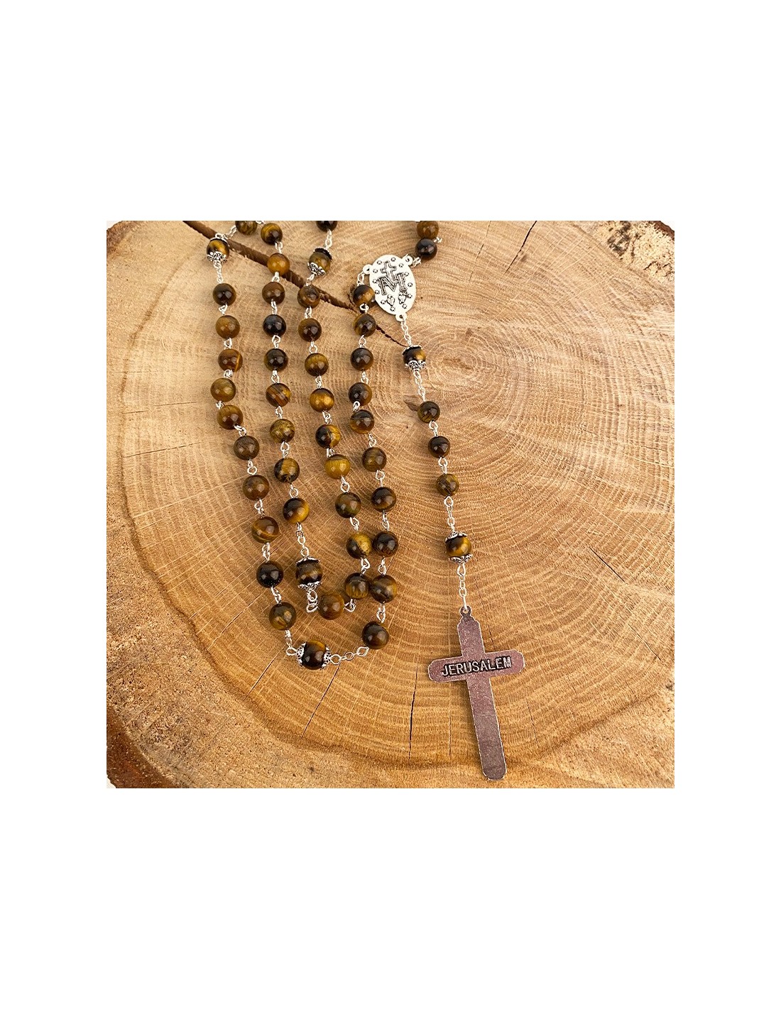 Rosary mounted on silver plated metal chain, with tiger eye beads. Delicate fine stone, the eye of tiger is a mineral with brown and ochre colors and yellow reflections flamboyant and beautiful. The central medal of the rosary is dedicated to the Miraculous Virgin with the words "O Mary, conceived without sin, pray for us who have recourse to you". The back of the medal is stamped with a Marian symbol. The finely carved cross with the features of Jesus, pendant of this rosary, is engraved on the back with the mention Jerusalem. It is kept in a beautiful box inside black velvet.