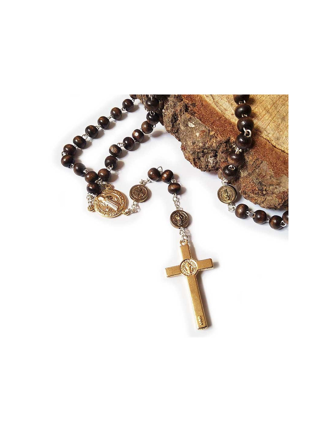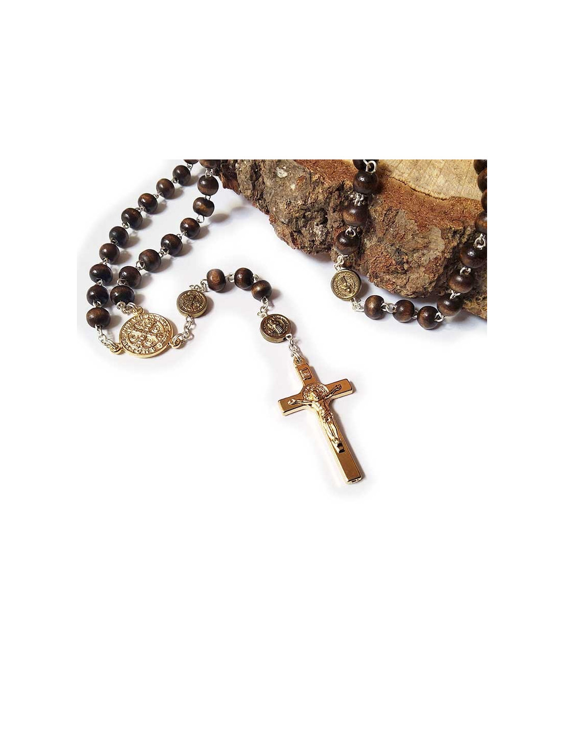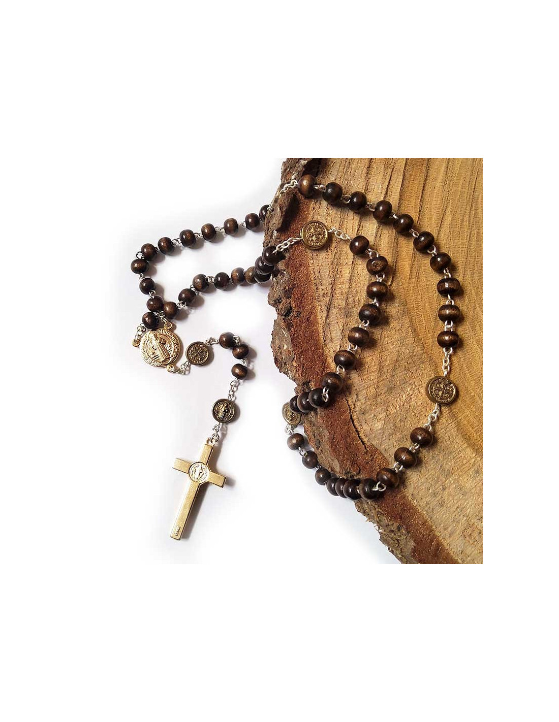 Brown wooden rosary with silver metal chain. The beads and the pendant are in gold metal, blending well with the brown of the wood. The beads bear the image of the medal of Saint Benedict, a powerful Christian symbol of protection.