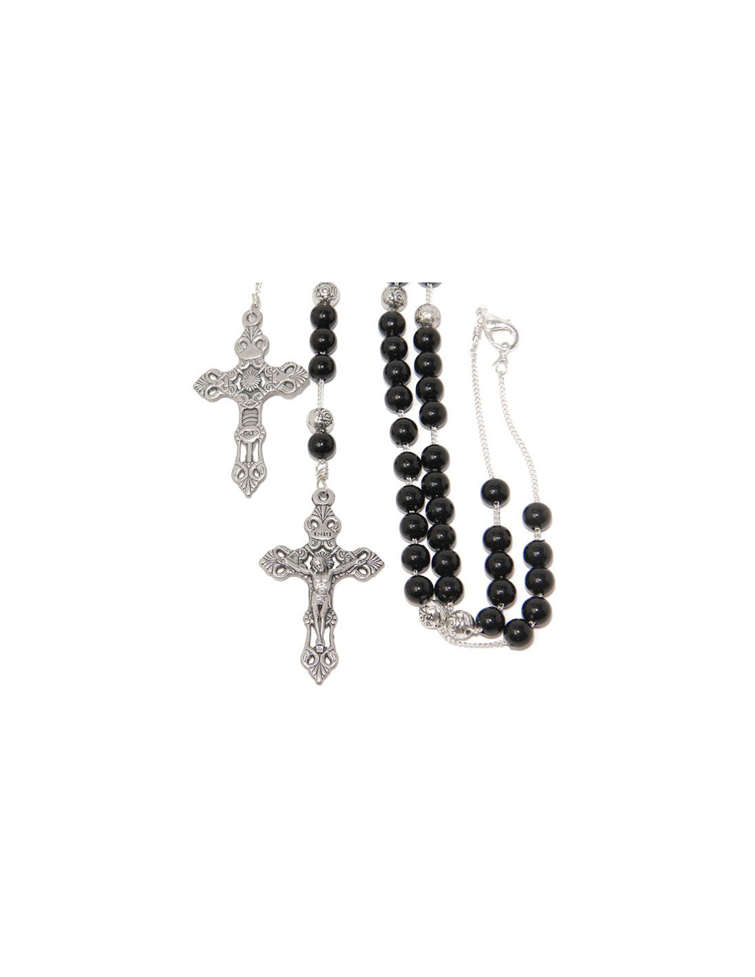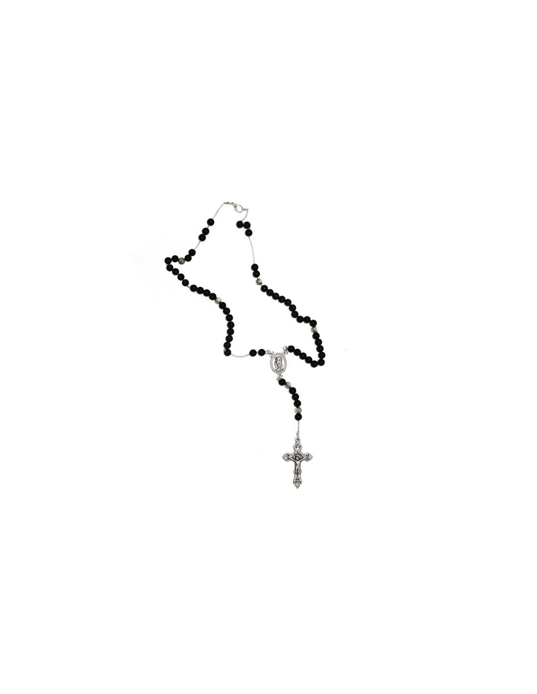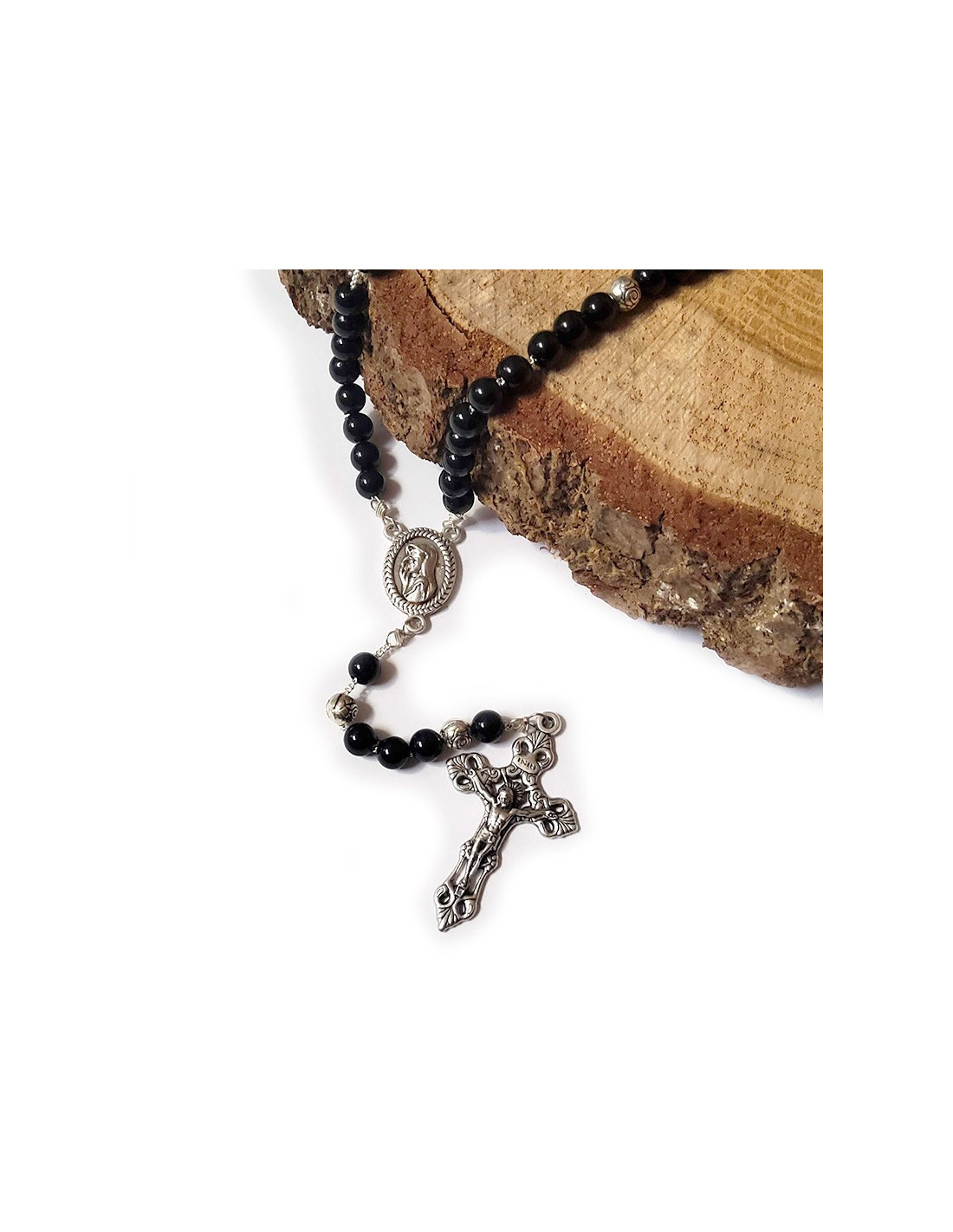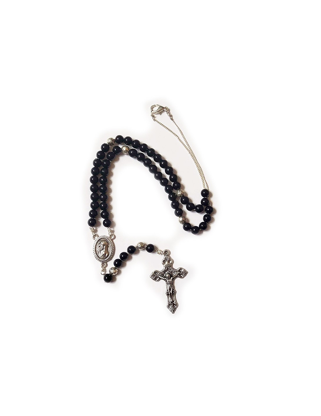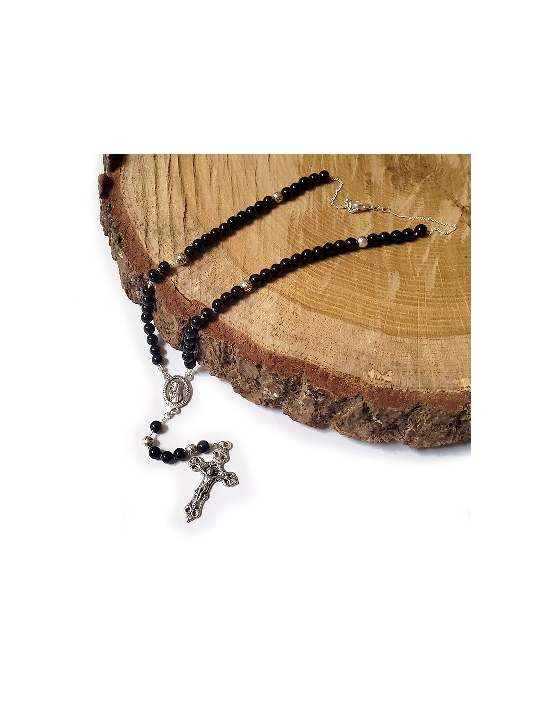 Discover our elegant rosary with black resin beads, mounted on a silver-tone metal chain. It features a Virgin Mary medal with "Ave Maria" engraved on the back. The pendant cross is delicately carved, adding a touch of elegance and spirituality. The chain closes easily with a practical clasp.