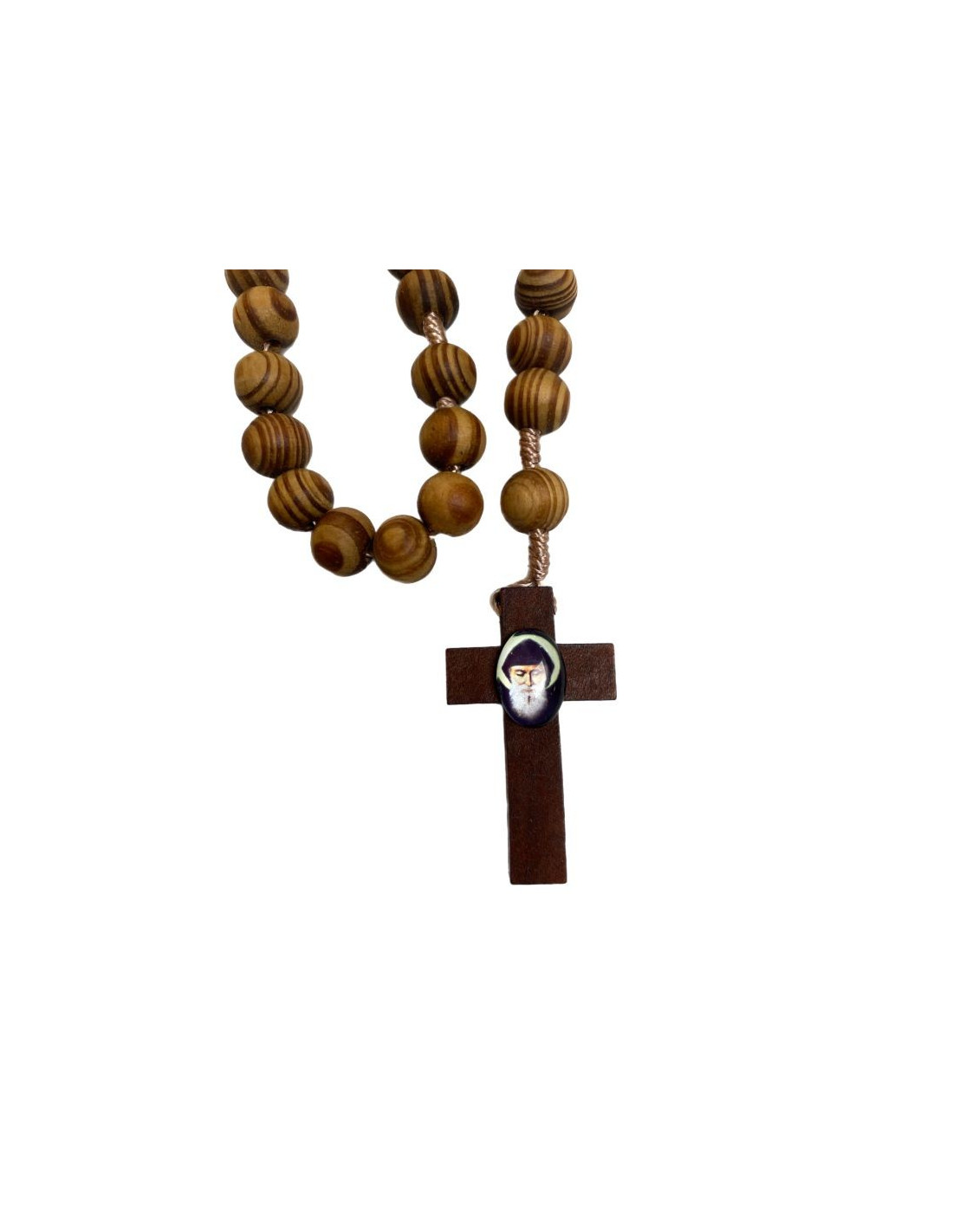 This natural olive wood rosary is a beautiful prayer object. Mounted on a light-colored cord, olive wood is easily recognized by its distinctive essence and soft, slightly oily texture. The cabochon on the cross pendant is a colorful image of Saint Charbel.