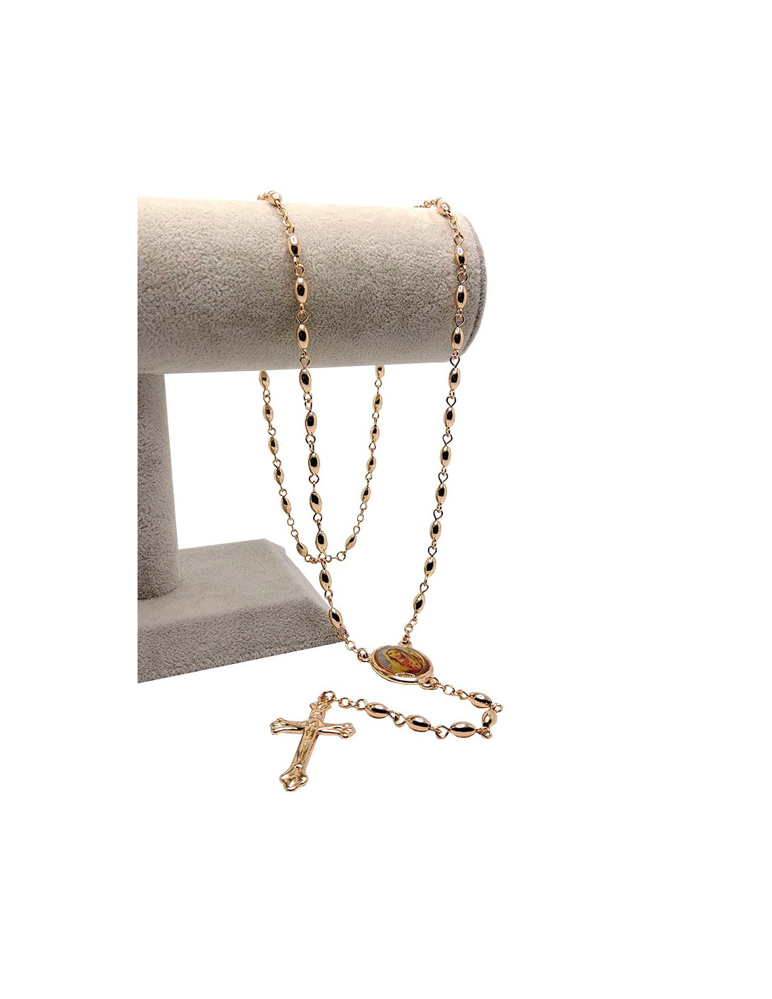Rosary with medal of the Sacred Heart of Mary, in 18-carat gold-plated environmental copper. The cross is in relief, very rounded, suggesting the forms of Jesus Christ. The medal of the Blessed Virgin is in color, under a shiny transparent resin, in warm tones. The rosary has a clasp, like a necklace, for easy insertion and removal around the neck.