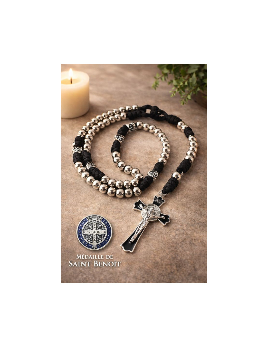 Elegant and durable Catholic rosary made of 10 mm metal beads, mounted on a strong braided cord. Featuring the Saint Benedict Cross and Medal, renowned for their powerful spiritual protection.