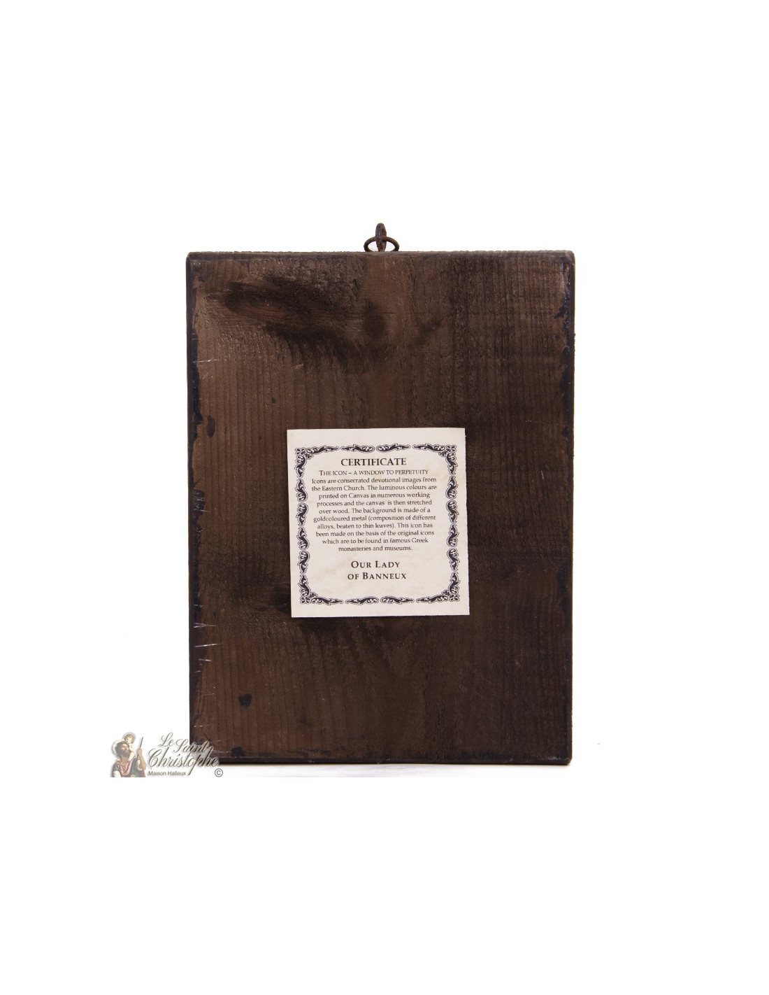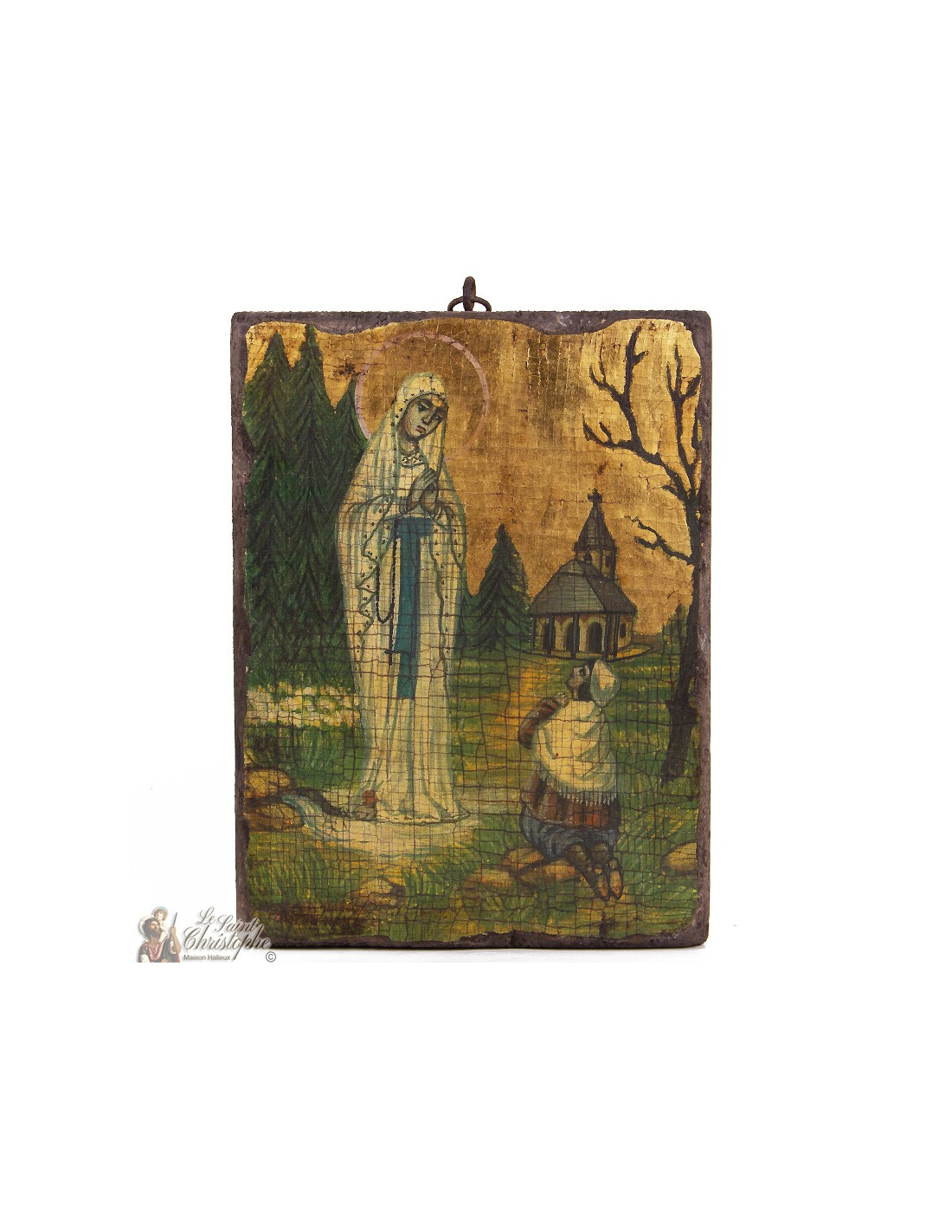 Banneux icon, large model. This gilded icon, hand-painted on a wooden base, depicts the apparition of Our Lady of the Poor of Banneux Notre-Dame, appearing before little Mariette Beco. It's a superb religious item for prayer and a wonderful gift for believers.