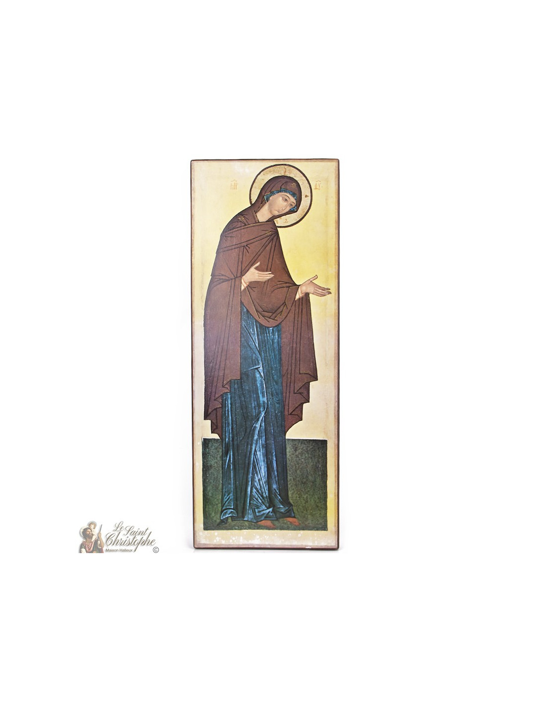 This Orthodox icon is a faithful reproduction of a 15th century work, depicting the Virgin Mary in an attitude of intercession. Her inclined gaze and open hands evoke gentleness, humility, and prayer. The Byzantine style, characterized by its slender lines and stylized draperies, reinforces the spiritual dimension of the whole. With its vertical format, it will find its place in a place of meditation or on a sacred wall.