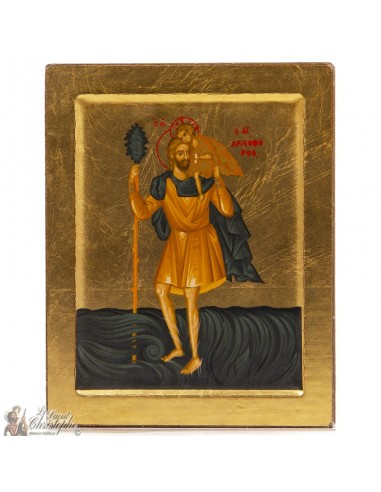 This Byzantine icon depicts Saint Christopher carrying the Infant Jesus on his shoulders, crossing a turbulent river. Painted on a wooden plaque, it is adorned with a gold leaf background, lending brilliance and sacredness to the image. The certificate of authenticity is on the back. This image encourages confidence and inner strength, particularly valuable for travelers or those seeking spiritual support.