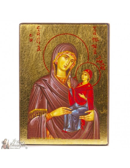 This Orthodox icon depicts Saint Anne, mother of the Virgin Mary, holding in her arms her infant daughter, already blessed and sacred. Handcrafted on wood gilded with gold leaf, it measures 7.30 x 9.30 cm and weighs approximately 80 g. This rare and symbolic representation expresses the faith passed down from generation to generation. A beautiful tribute to the roots of Marian spirituality, conducive to family prayer.