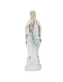 Resin statue of the Virgin of Lourdes, realized and painted by hand with some golden touches on the braids and the rosary that the Blessed Virgin holds. The few folds passed to the pastel blue give it depth and a delicate touch on the white of its dress and its base.