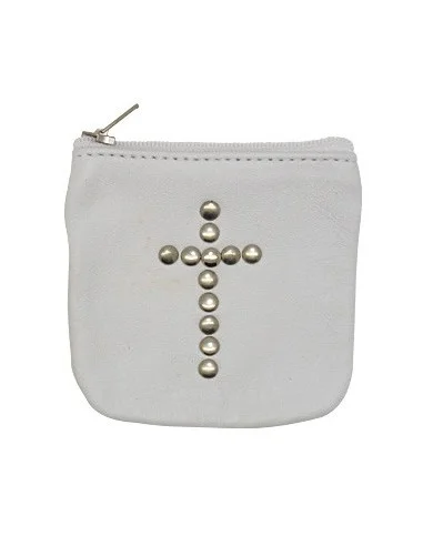 Leather case with decoration in round metal studs forming a cross. This small pouch can hold a decade or a rosary, serve as a purse, or hold other objects that are important to you. The case is entirely handmade.