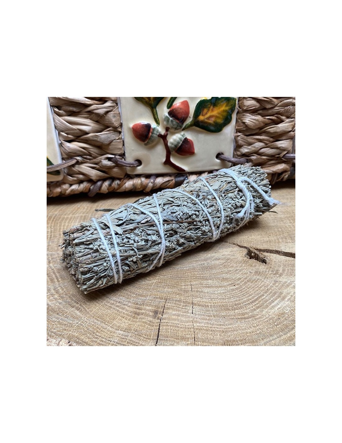 One of the ends of the bundle is set on fire in order to proceed to fumigation. Once the leaves burn, one blows on it to have just a small border of combustion. By doing so, we purify the air which surrounds us. This purification drives out the negative energies from places, people or objects. This bundle also makes it possible to reload the places with positive energy thanks to lavender.