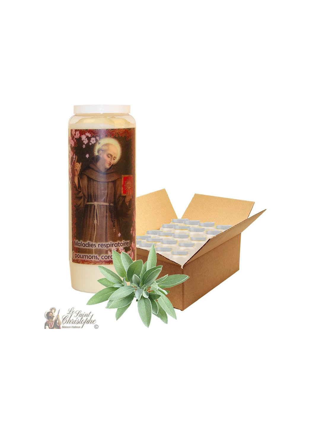 Vegetable novena candle scented with sage with image of Saint Bernardine of Siena and prayer dedicated to him at the back. This saint is to be prayed during respiratory diseases. A perfect combination for air purification.