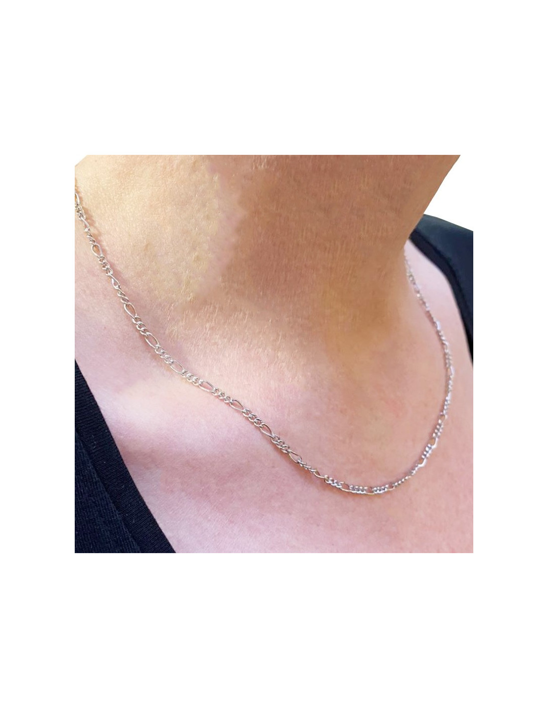 Figaro chain 45 cm in silver 925 rhodium, recognizable by its elongated and round links that follow each other in a rhythm of one Figaro link for three Forçats. Very comfortable, this chain is sophisticated and chic, to be worn alone or harmoniously married with a pendant.