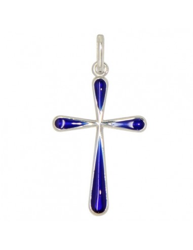 Blue enamelled pendant in the shape of a cross, in real silver 925. The cross is very rounded, in the shape of droplets, a very soft design. Jewel in real silver 925. Dimensions : 15 x 25 mm. Weight : 2 gr.