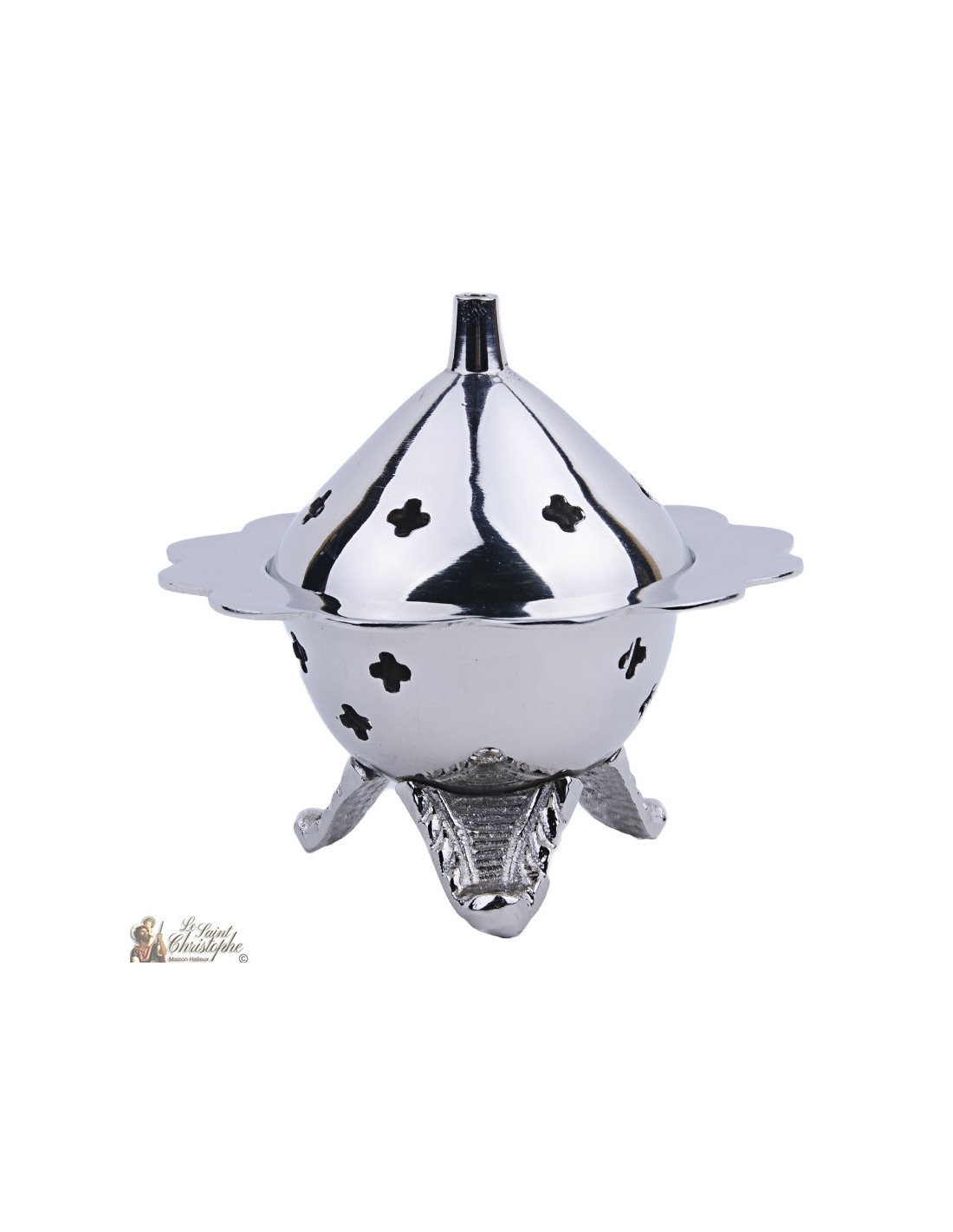 This silver-plated censer has the particular shape of a flower thanks to the edges of its container. The holes are cut in a cross with rounded edges. The censer rests on three delicately carved feet. It has been entirely carved by hand.