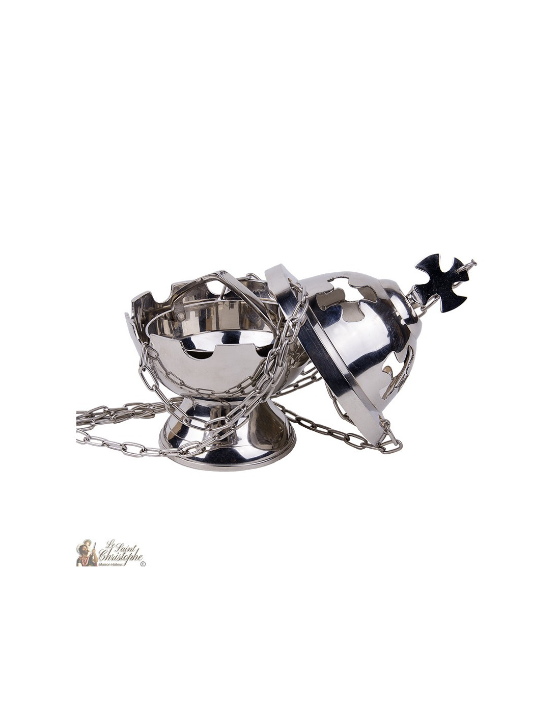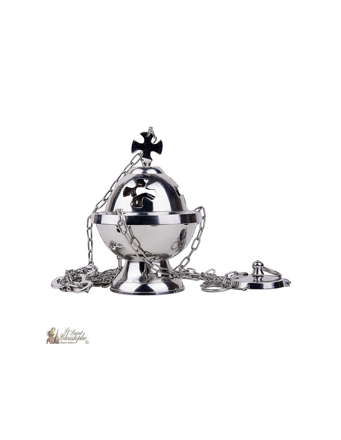 This silver-plated censer is equipped with chains to facilitate its handling. Several crosses decorate its lid, either by surmounting it to decorate it, or by serving as a hole to let the smoke of the incense pass.