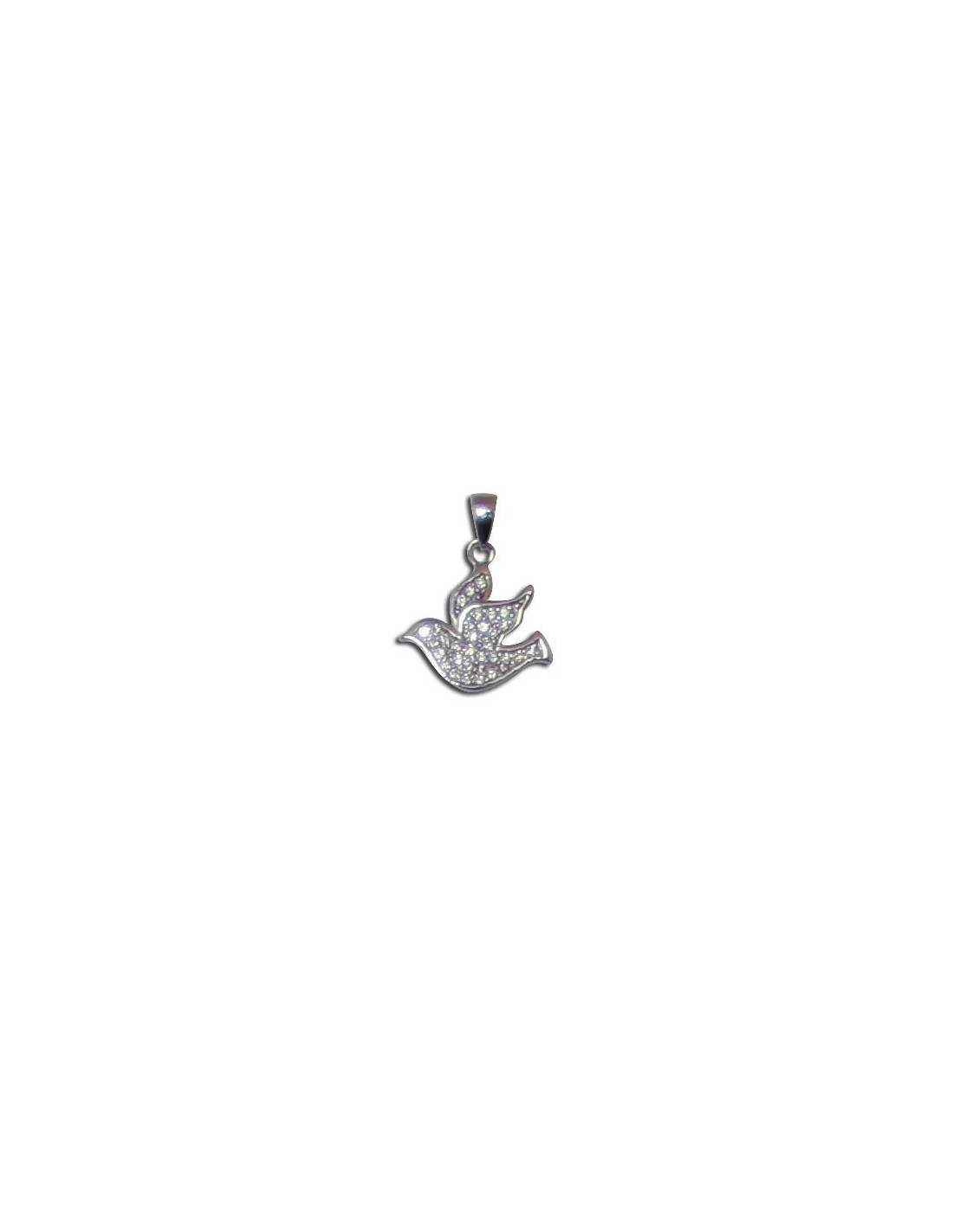 Pendant in the shape of a dove, wings open. It is made of genuine silver 925 and encrusted with rhinestones. Entirely handmade. Dimensions: 15 x 10 mm.