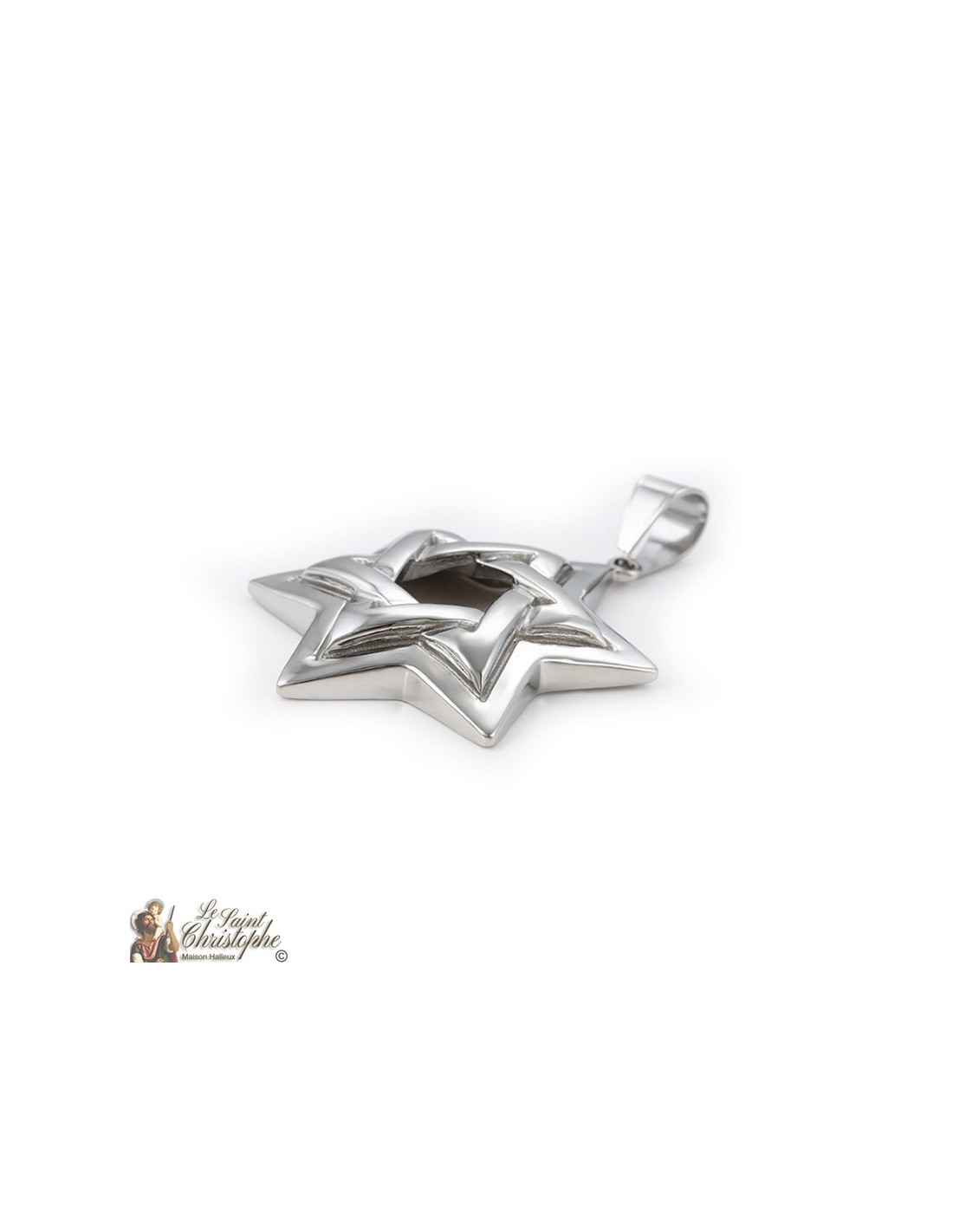 Stainless steel pendant in the shape of a Star of David, also called the Seal of Solomon. This star is double, one in outline and the other with intertwined traces giving relief to the pendant and a delicate aspect.