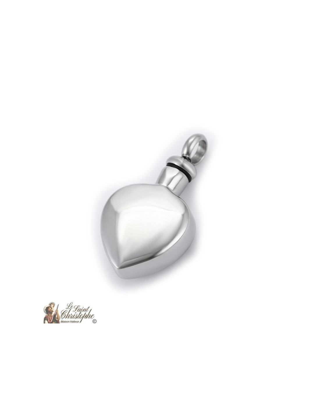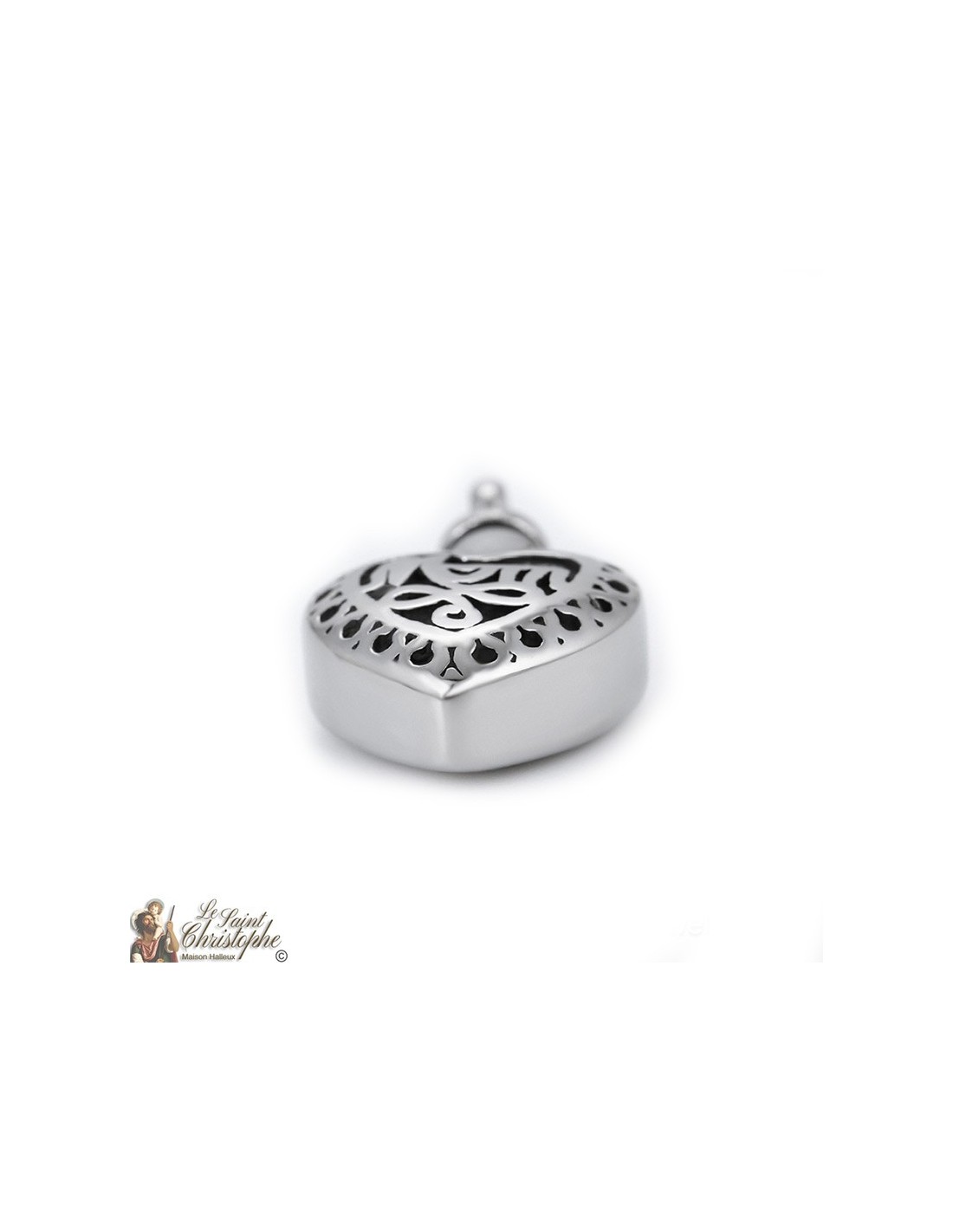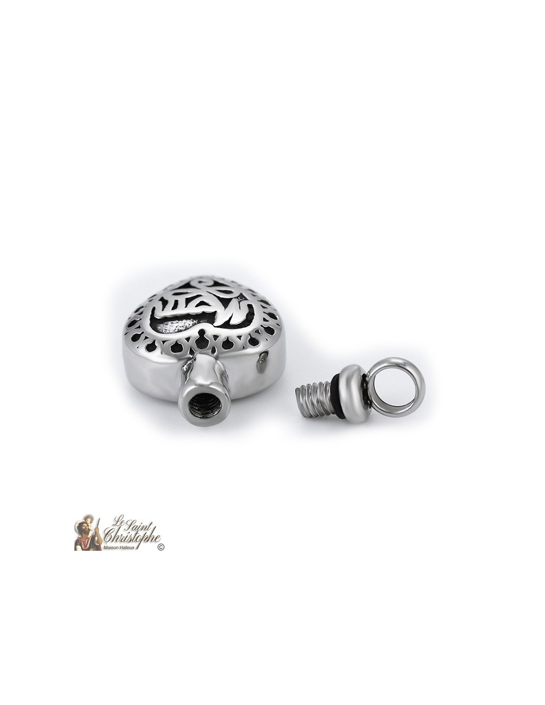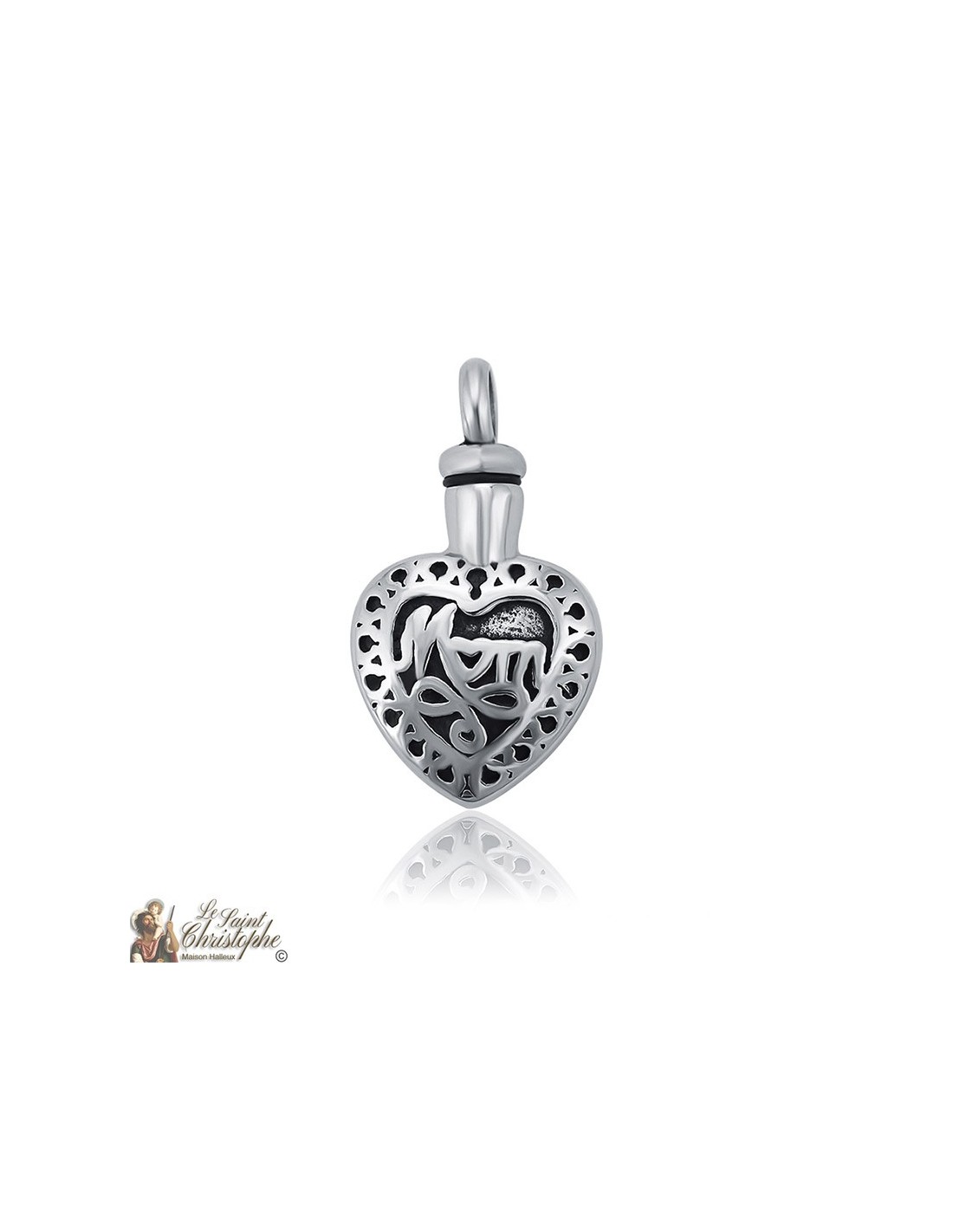 Stainless steel cinerary pendant, to hold funeral ashes. This model is heart-shaped, nicely decorated and enameled in black to enhance the contrast. The word "Mom" is inscribed in the center.