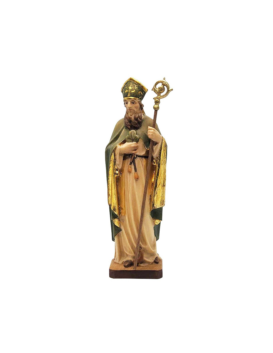 Statue of Saint Patrick, handcrafted from wood, carved and painted by hand. The delicate finishes of this statue are detailed, bringing the character to life. Saint Patrick is depicted dressed as a bishop, wearing a mitre and carrying a crozier, all in shades of green. He holds a shamrock to his heart. The inside of his cape, the decorations on his mitre, and the top of his crozier are painted gold, enhancing the colors of the holy figure.