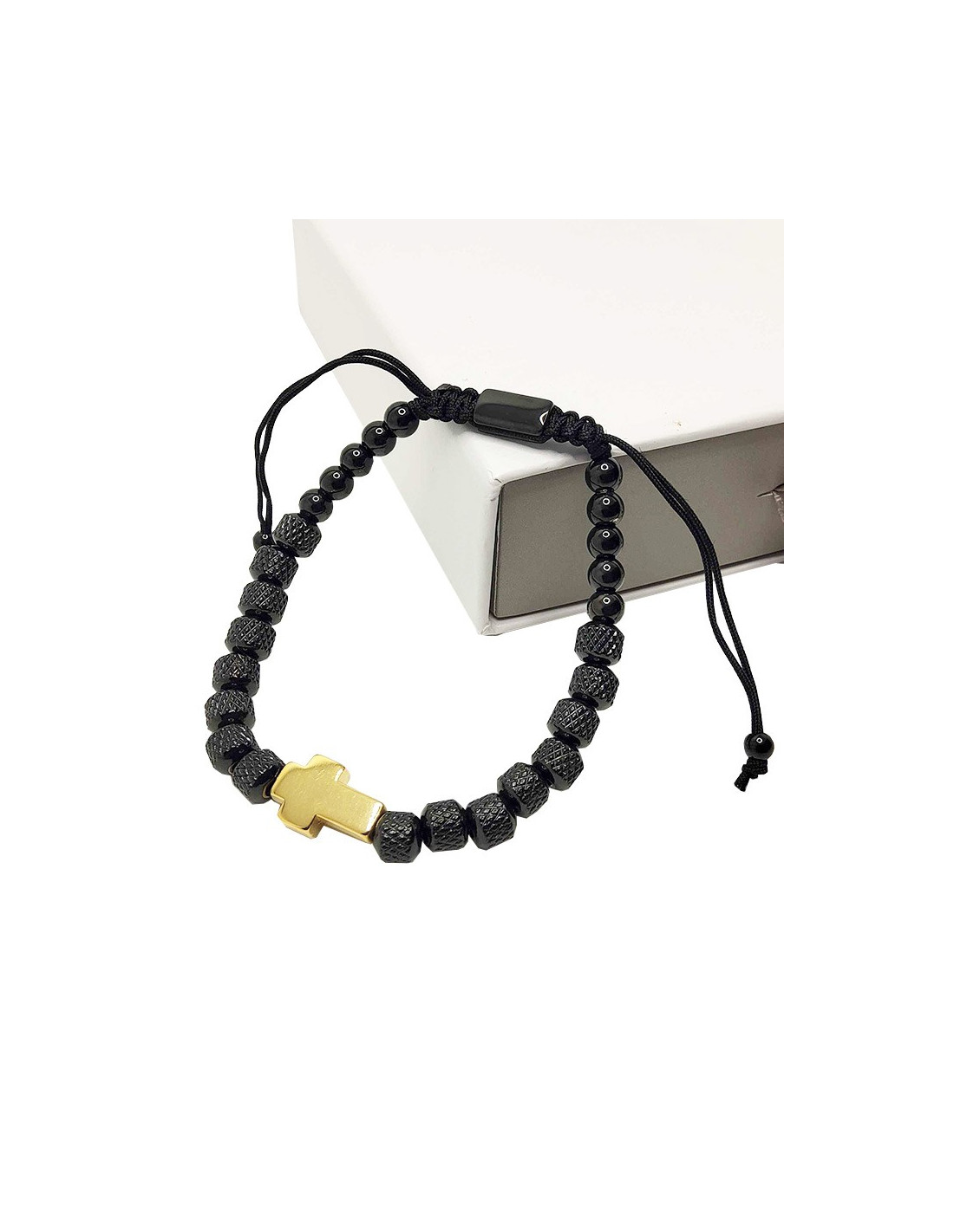 Bracelet with gold cross and black stainless steel beads mounted on a black cord with adjustable macramé clasp.