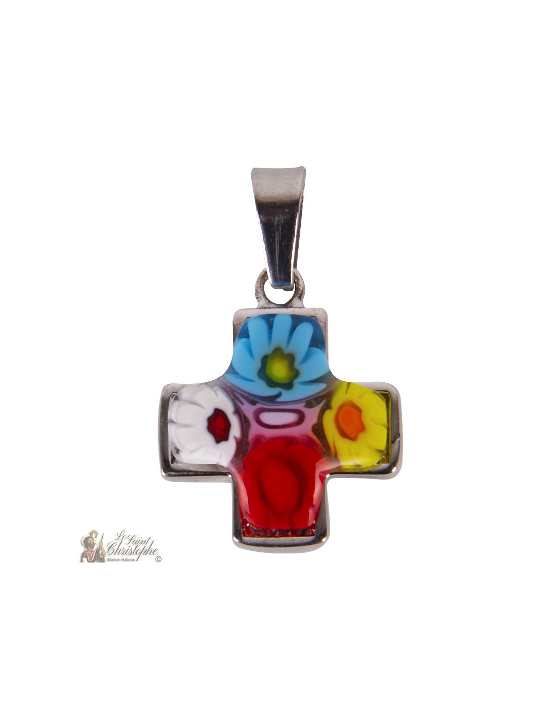This stainless steel pendant is covered with the famous Murano glass! This very colored glass with complex patterns forms several flowers on the cross. Italian Murano is a city in the surroundings of Venice famous for its mastery of glass. A typical jewel in the colors of the Mediterranean.