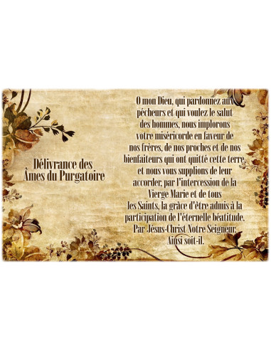 The sticker features an image of a parchment decorated with plant motifs and a prayer dedicated to the Deliverance of Souls from Purgatory.