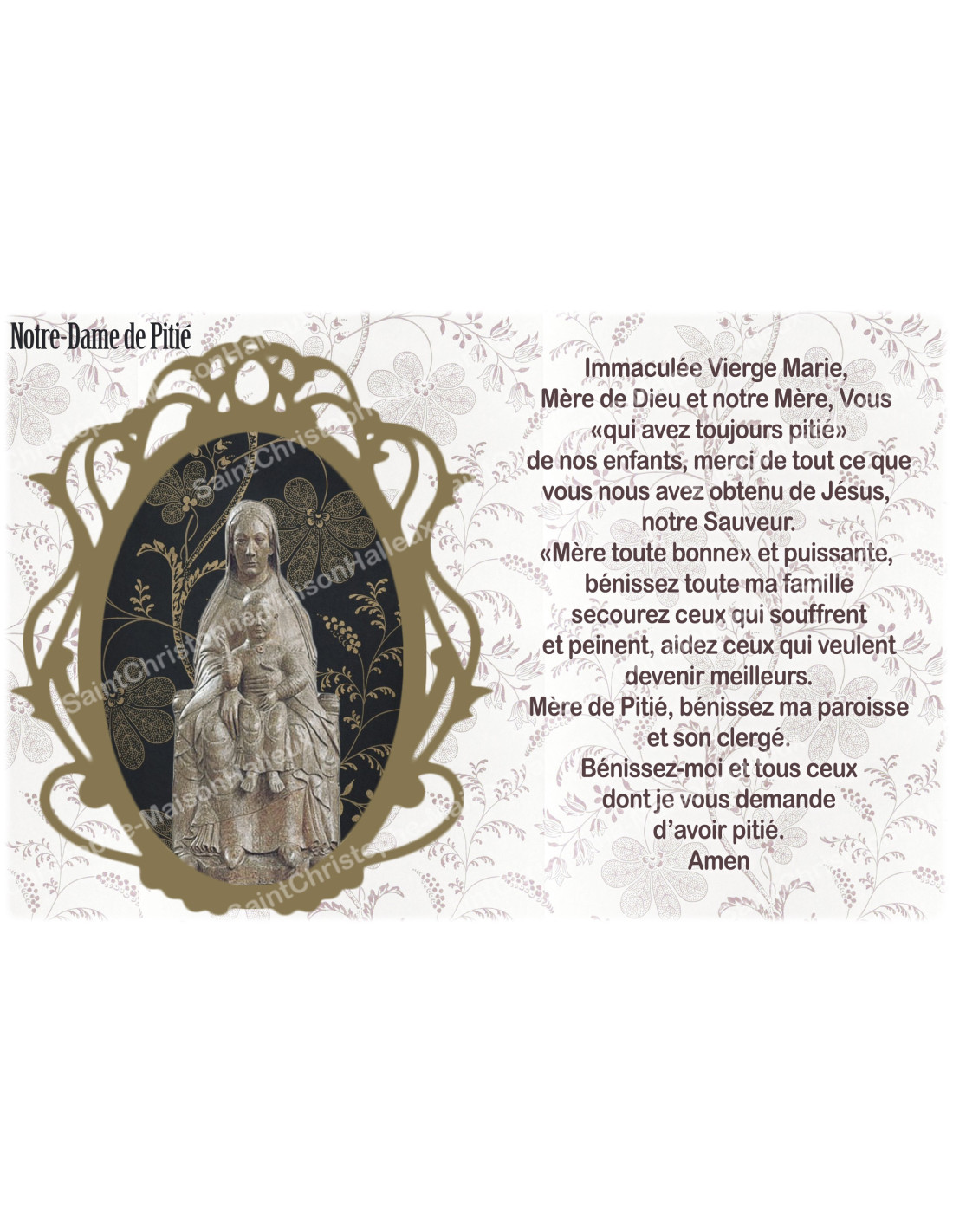 The sticker features an image of the statue of Our Lady of Mercy with the Baby Jesus sitting on her lap, with a prayer dedicated to her on a background of floral motifs.