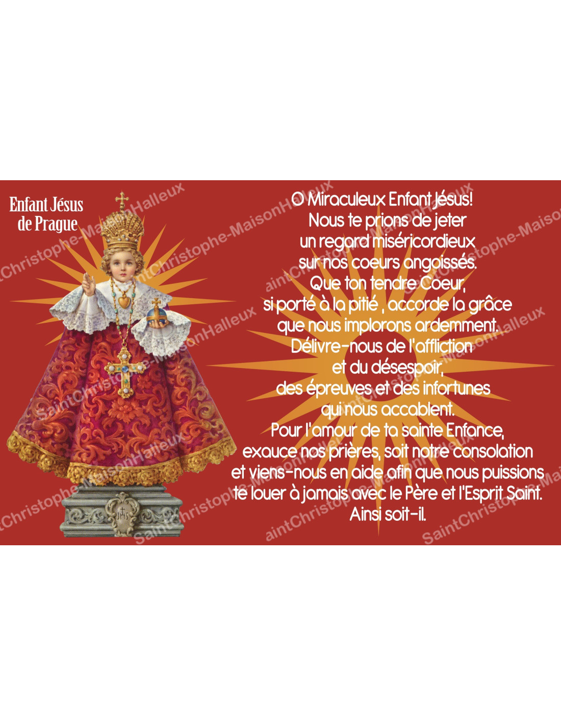 Sticker for novena candles with image of the Infant Jesus of Prague and dedicated prayer, red background. Designed to cover the entire circumference of a candle 6 cm in diameter and 18 cm high. This sticker is recommended for white novena candles but can be used on colored candles according to your preference.