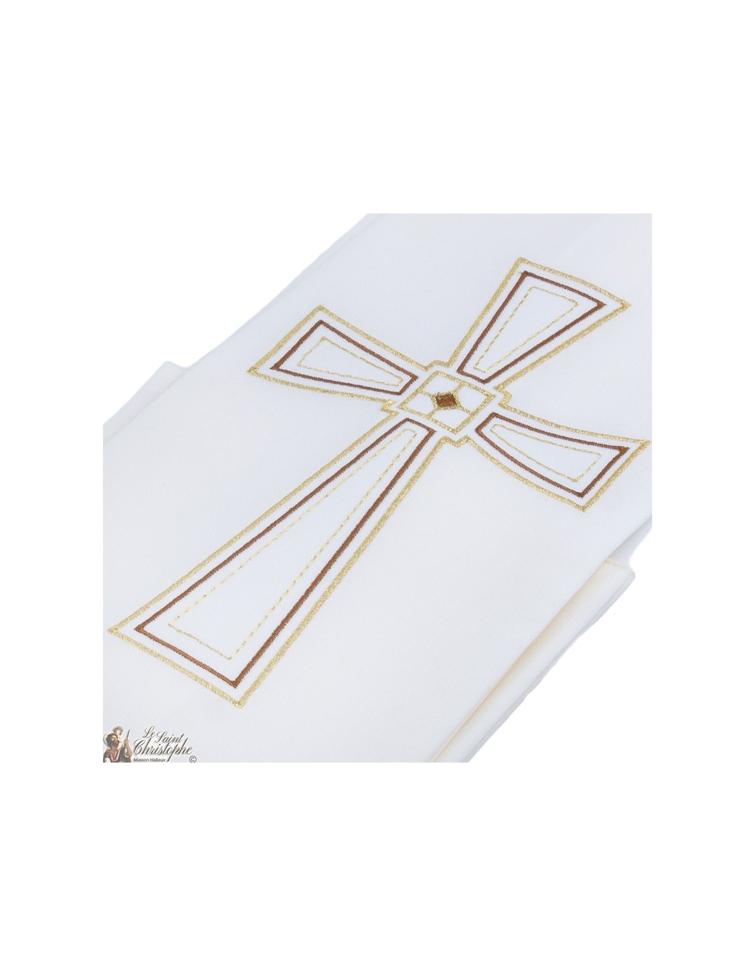 Stole for priest creamy white color, and embroidered with an imposing and geometric cross with copper brown and gold threads. The stole and embroidery are entirely handmade. Machine washable.