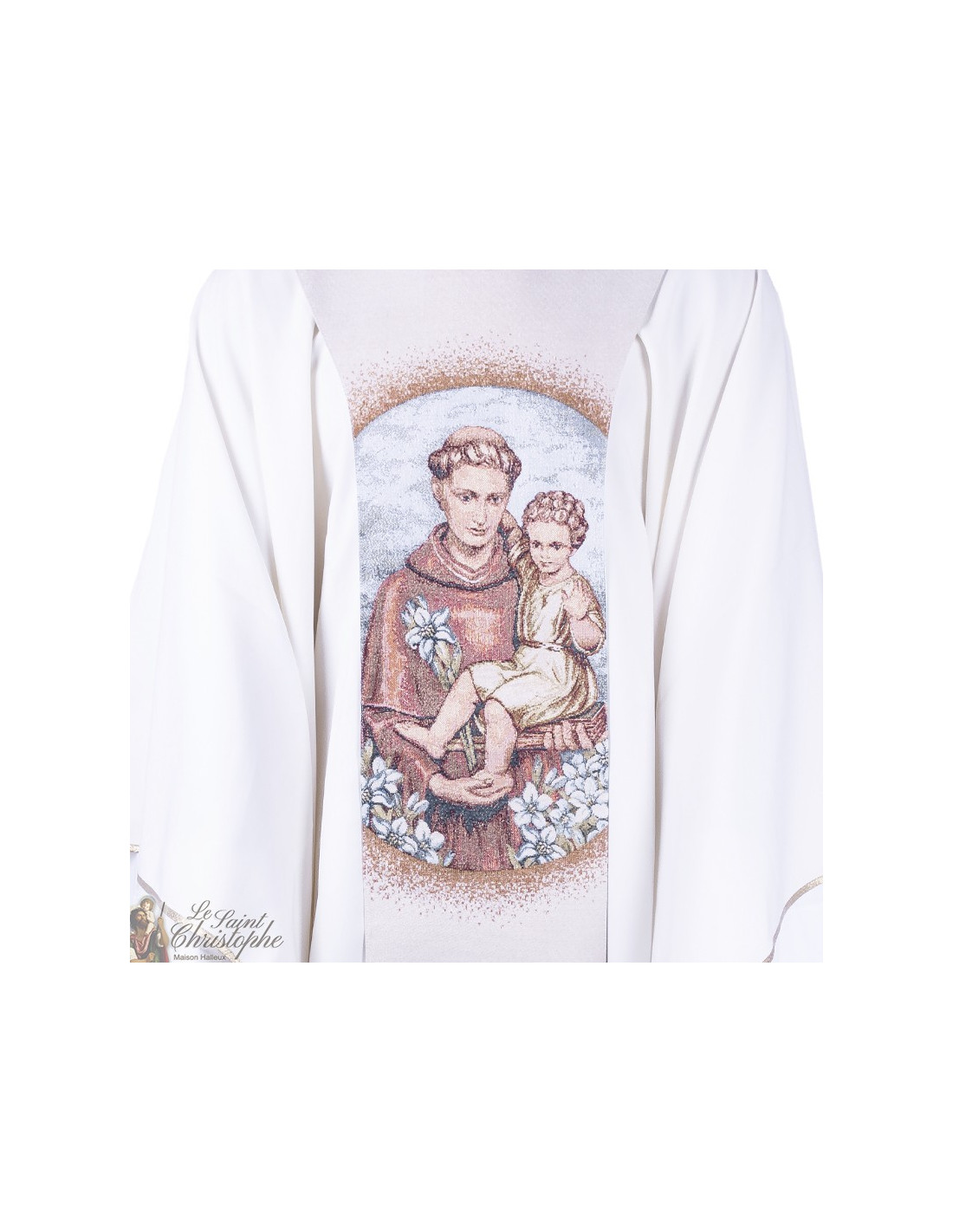 -50% Stoles St Michael the Archangel embroidered priest stole 15651 €122.50 €245.00 Priest's stole embroidered with St. Michael the Archangel on the right panel and a cross on the left panel. The embroidery is woven in the style of Bruges tapestries. The length from the back to the end of the panel is 142 cm. Length from neck to knee is 106 cm. Add to cart