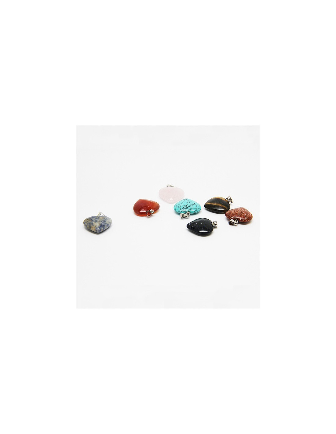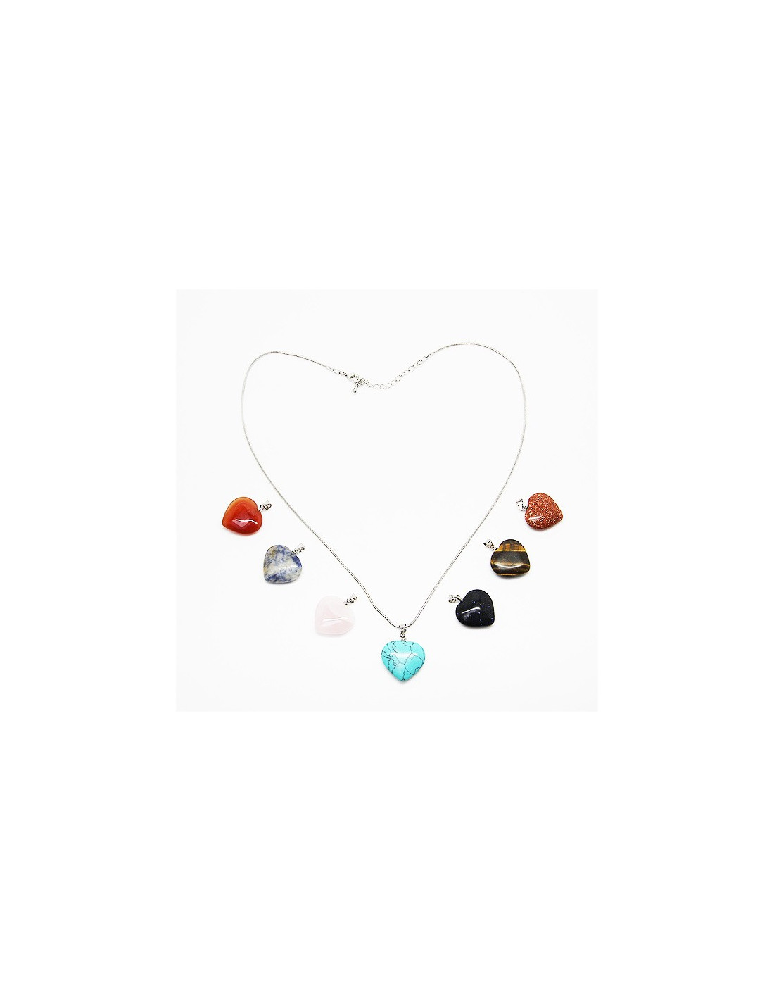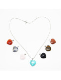 This necklace is supplied with 7 heart-shaped pendants. The seven stones are carnelian, gold stone, tiger's eye, pink quartz, reconstituted turquoise, sodalite and purple stone.