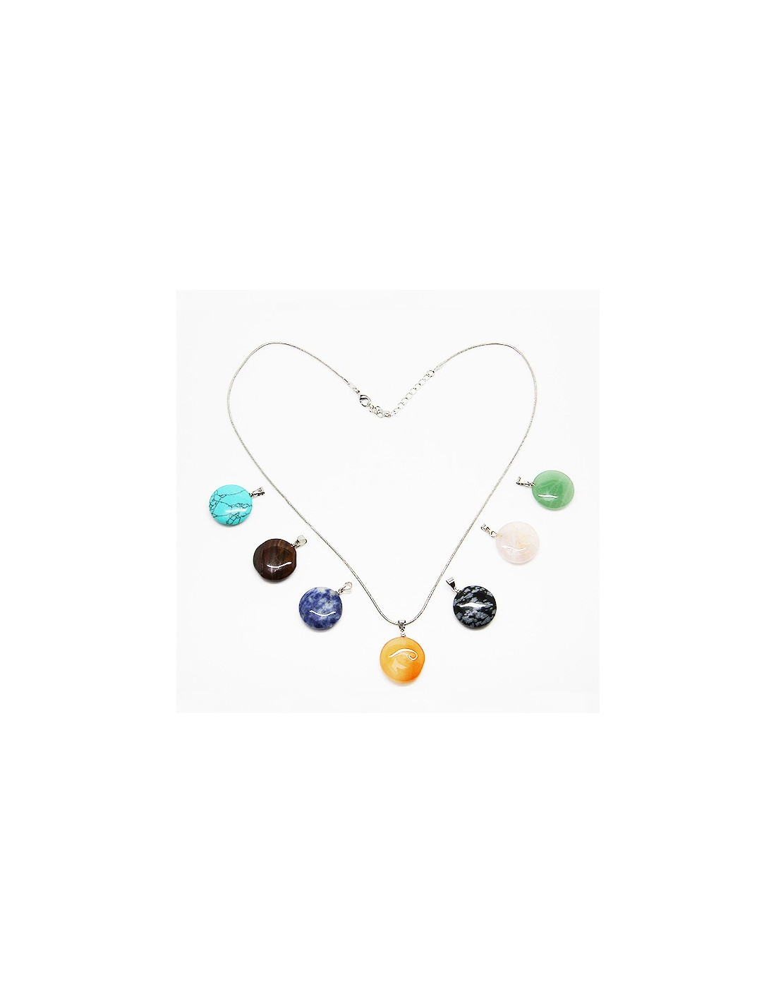 This necklace is supplied with 7 round pendants. The seven stones are snowflake obsidian, carnelian, tiger's eye, pink quartz, green aventurine, reconstituted turquoise and sodalite.