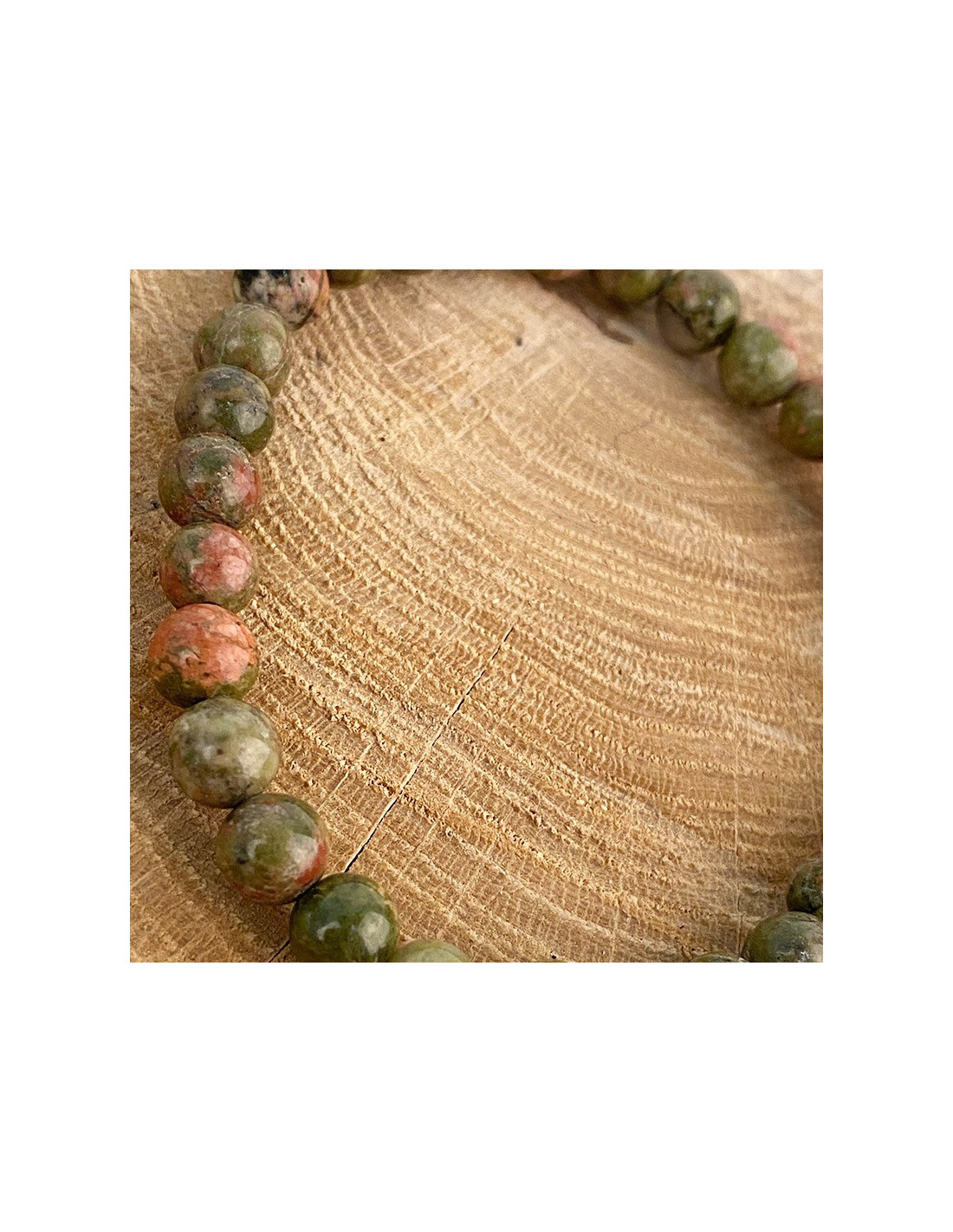 This elastic unakite bracelet is a delightful soft and natural touch to wear on your wrist.