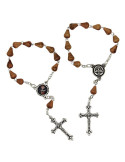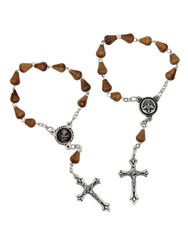 This ten-bead rosary is made of natural olive wood, with beads shaped like drops and mounted on a silver-tone chain. At its center is a medal showing Saint Benedict and the Holy Spirit, with a metal cross below. Compact and practical, it fits in your pocket and serves both prayer and faith.