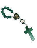 Artisanal wooden rosary with green cross and images of Our Lady of the Poor of Banneux Notre-Dame. 6 mm beads on white cord. Discreet spiritual object, ideal for prayer or as a religious souvenir.