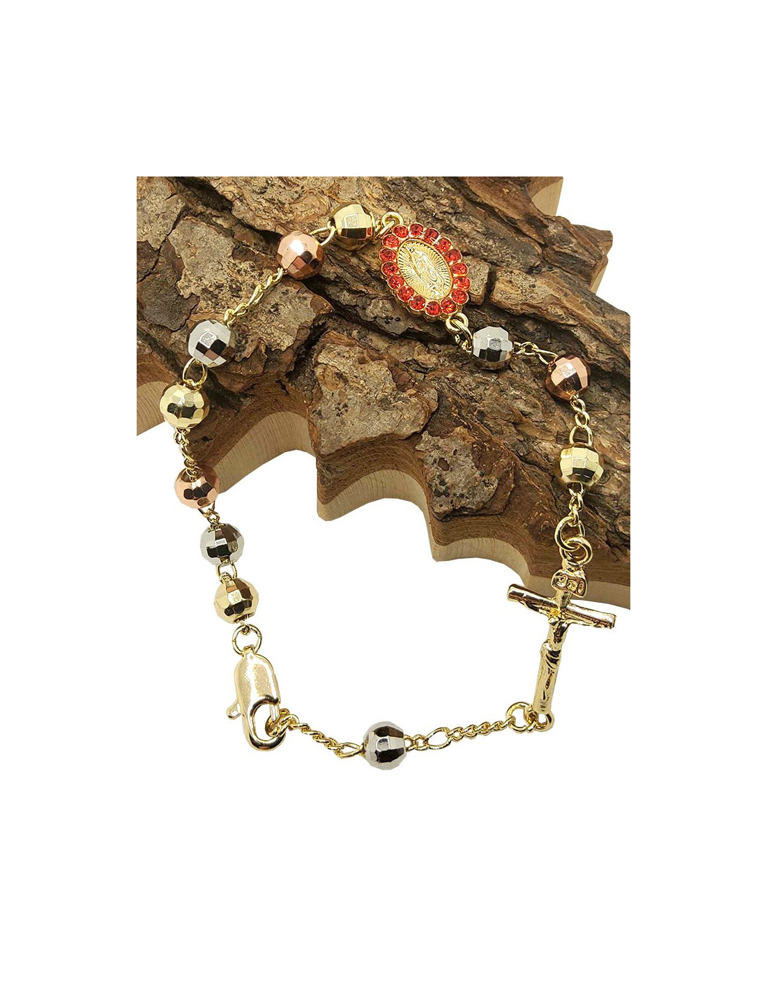 This superb gold-plated copper dizainier bracelet combines elegance and spirituality. Its faceted beads in shades of gold, silver and bronze catch the light, while the gold medal set with red crystals, representing the Virgin Mary, adds a sacred touch. The bracelet is finished with a finely sculpted cross, making it an ideal accessory for prayer or for discreetly affirming one's faith on a daily basis. A great idea for a spiritual gift, this ten-piece bracelet is both chic and timeless.