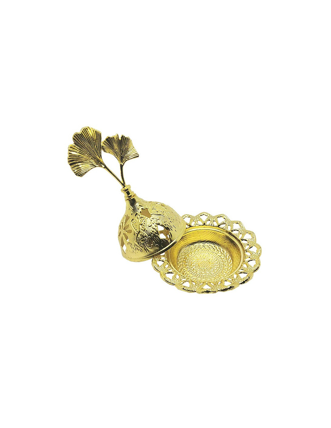 Small-sized incense burner for incense cones, in gilded metal with lid topped with gingko leaves.