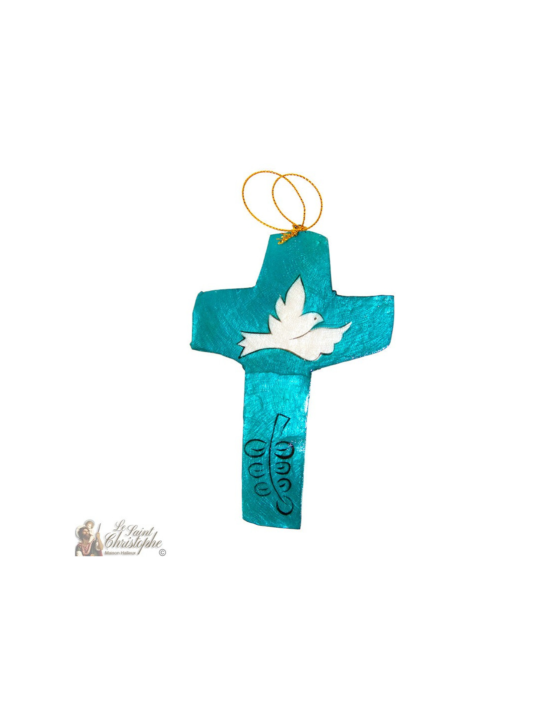 Fine hand-painted mother-of-pearl mural cross. A dove and an olive branch are represented, stylized, on a plain turquoise blue background. The mother-of-pearl gives an intensity and vibrancy to the colour which is very pleasing to the eye. The cross is painted on both sides.