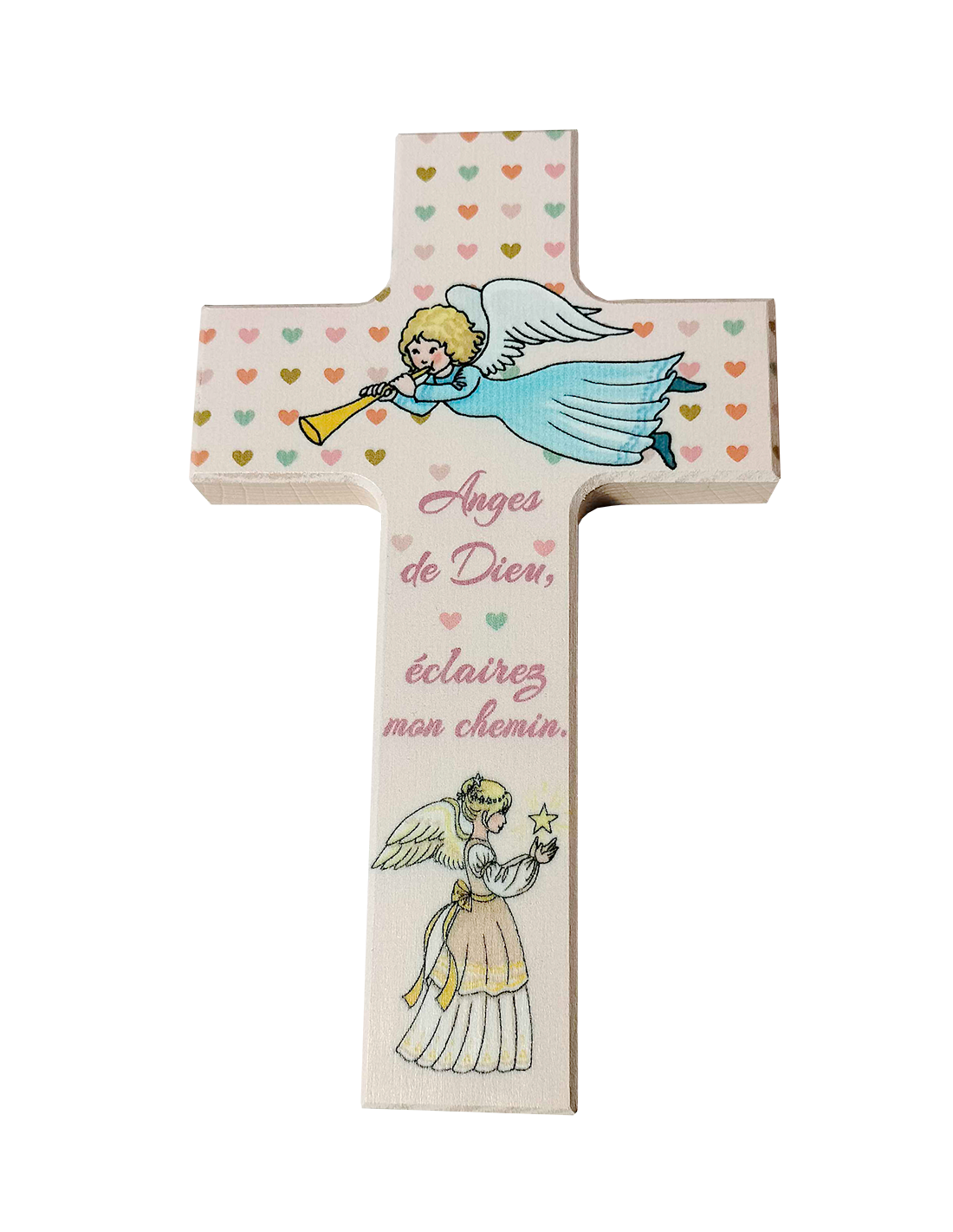 Wooden cross to hang or place, ideal for a child's room. Perfect as a gift for a baptism or a communion, this cross is illustrated with two angels and a small prayer in French: Angels of God, light my way. Its soft colors, its pastel illustrations, all make it a unique item to decorate the room of a little boy or a little girl.