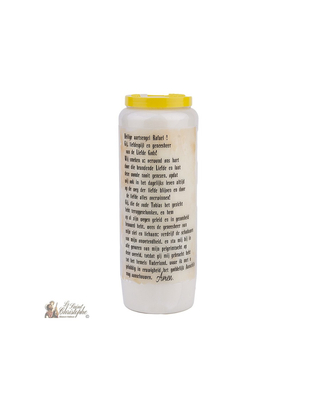 Plant novena candle with image of Saint Raphael and prayer dedicated to him.