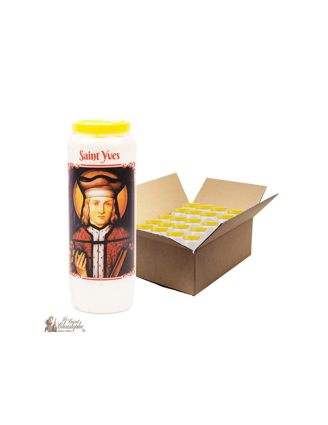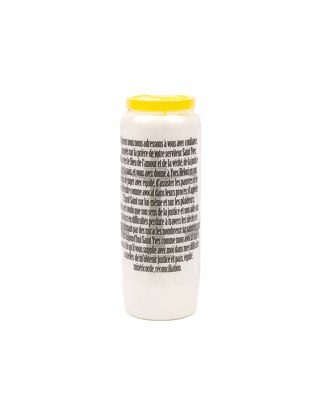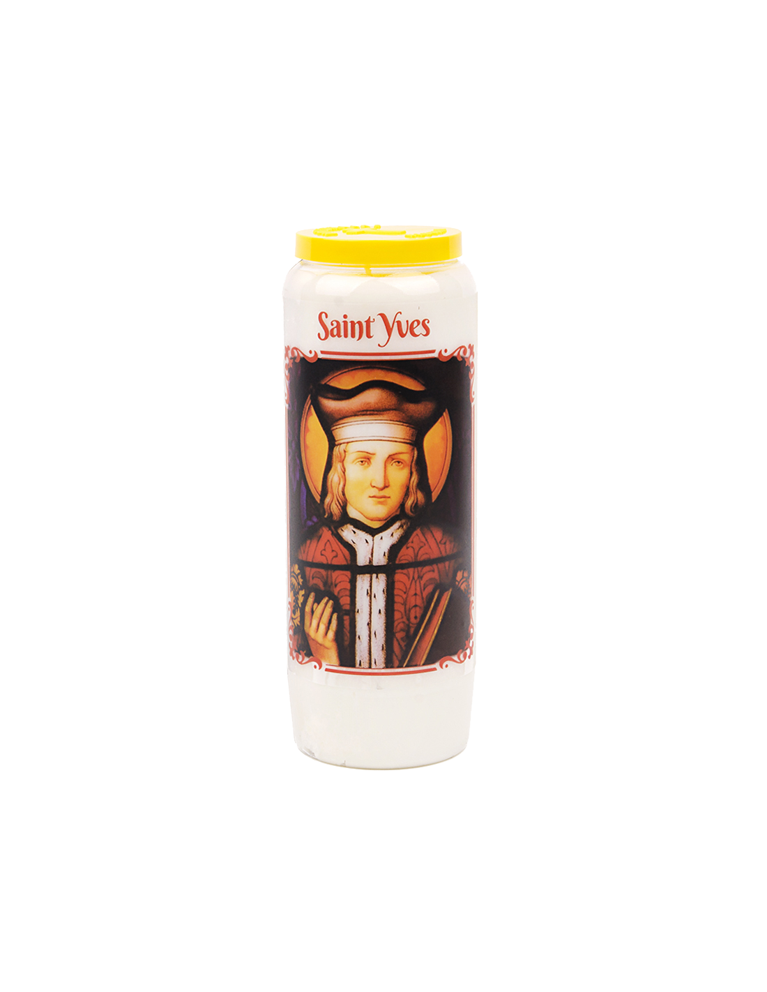 Novena candles in vegetable oil with an image of Saint Yves and a prayer dedicated to him.