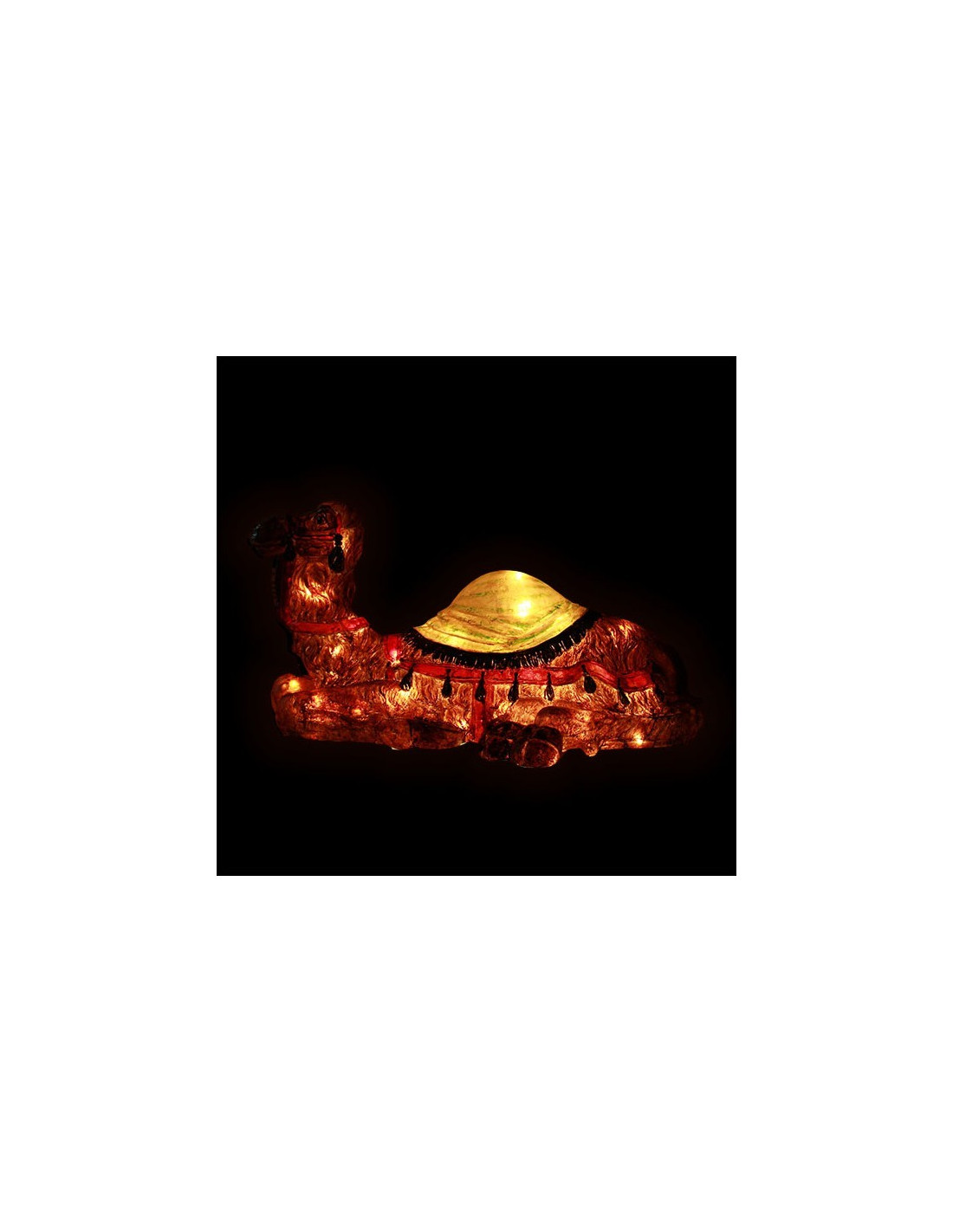 Este camello colorido de fibra de vidrio está diseñado para acompañar figuras de 80 cm de altura. Perfecto para completar un belén monumental, una escena oriental o una decoración exterior, aporta un toque realista y elegante a su instalación. Pintado a mano, presenta tonos naturales y decorativos que se integran armoniosamente en cualquier decoración.
