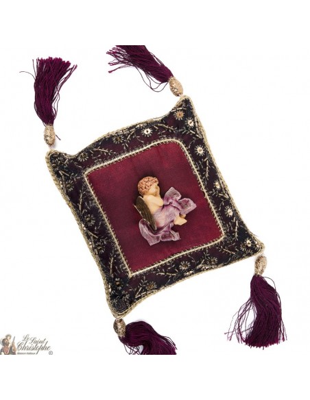 El color burdeos intenso, acompañado de bordados dorados y de un ángel dormido con alas doradas, convierte esta pieza decorativa en un objeto lleno de simbolismo, serenidad y protección.