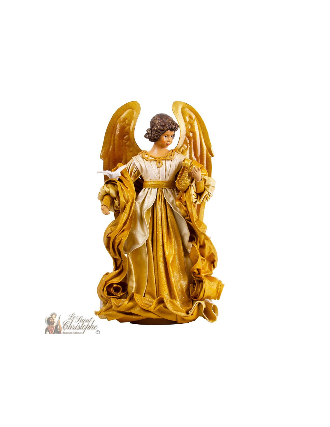 Ángel dorado y drapeado con paloma y arpa 40 cm